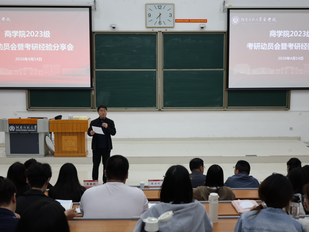 为助力2023级学生明晰考研方向、掌握科学备考方法,4月14日,商学院在文昌楼102教室精心组织2023级学生考研动员会暨考研经验分享会。商学院院长刘英基、副院长宋跃刚、研究生工作秘书夏会珍、2023级专兼职辅导员以及全体2023级学生齐聚一堂,共同参与此次盛会。会议由商学院党委副书记陈清利主持。