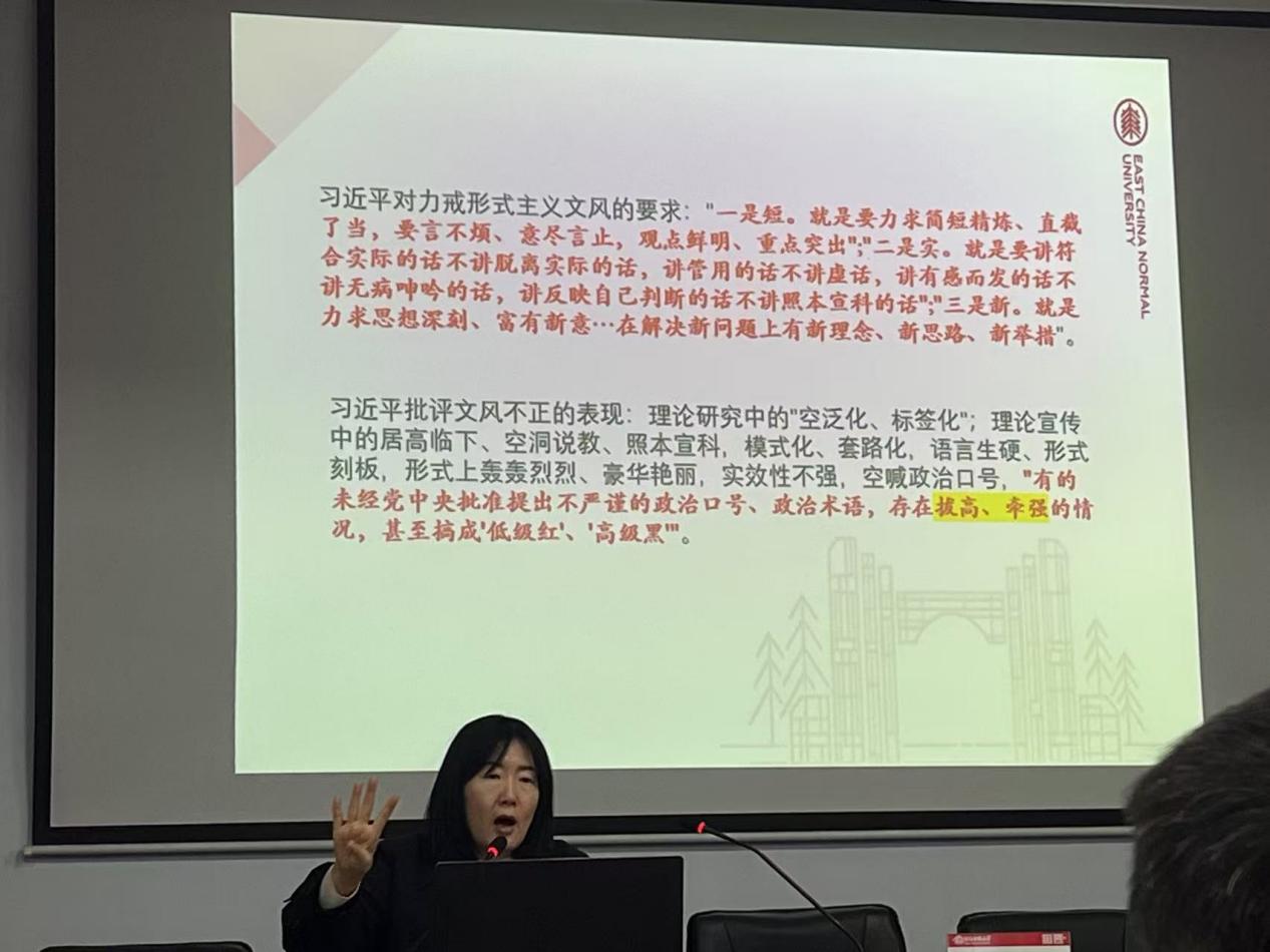 14日,华东师范大学马克思主义学院陈红娟教授应邀为院师生作主题为“习近平文化思想对马克思主义文化理论的创新发展”的学术讲座,讲座在平原楼108举行。本次讲座由马克思主义学院副院长余保刚教授主持,马克思主义学院教师代表及硕博研究生参加了此次讲座。