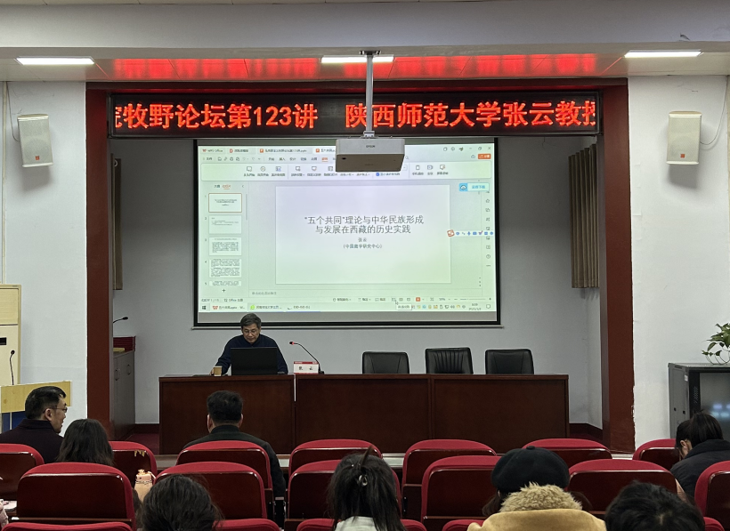 讲座伊始,张云教授以党的民族政策在西藏的实践发展为例,深入阐述了“五个共同”的深刻内涵及其理论与实践意义。他指出,中华民族有着五千多年的文明史,各民族共同开拓了祖国的辽阔疆域,缔造了统一的多民族国家,书写了辉煌的中国历史,创造了灿烂的中华文化,培育了伟大的民族精神。张教授围绕中华民族发展规律的新认识展开阐述,他强调各民族交往交流交融是中华民族形成发展的动力主线。会议最后,张云教授详细阐明了中华民族共同体建设的根本路径。他着重指出,铸牢中华民族共同体意识是全党全国各族人民的共同任务,需要始终坚持党的领导,构筑中华民族共有精神家园,加快民族地区高质量发展,推动各民族全方位融入,依法治理民族事务,加强历史理论研究及对外人文交流。