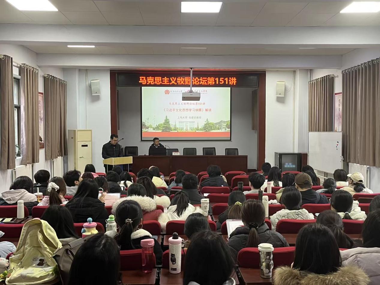 12月4日,上海大学岳爱武教授应邀为河南师范大学马克思主义学院师生作了题为“《习近平文化思想学习纲要》解读”的专题讲座。这是河南师范大学马克思主义学院牧野论坛第151期,讲座在平原楼108举行。本次讲座由马克思主义学院副院长余保刚教授主持,马克思主义学院教师代表及硕博研究生参加了此次讲座。