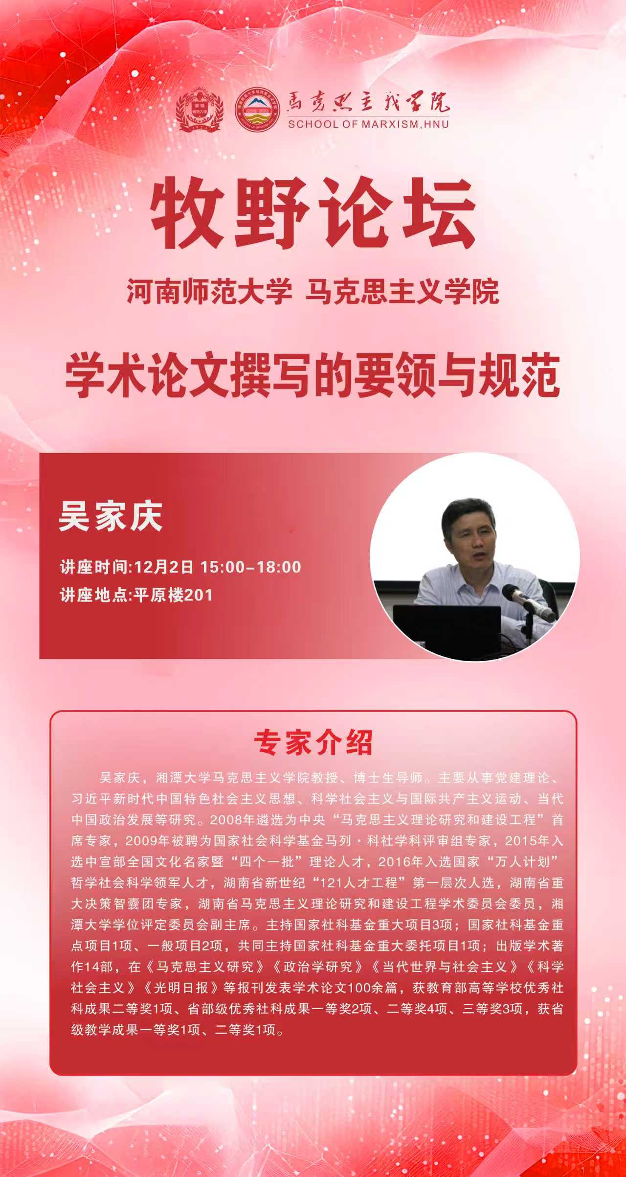 马克思主义牧野论坛 湘潭大学吴家庆教授讲学通知