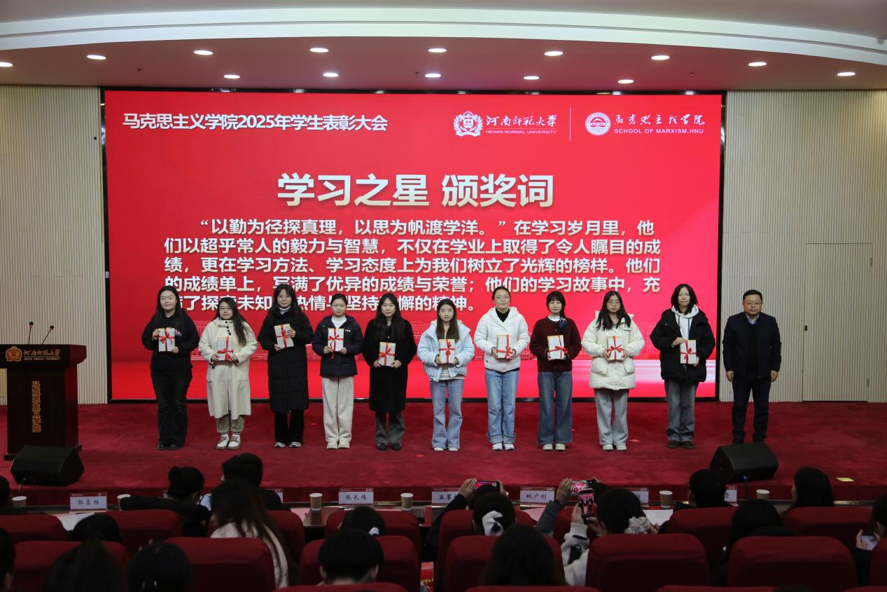 大会在庄严的国歌声中拉开序幕。马克思主义学院副院长姚广利宣读2025年学生表彰决定,对本年度在集体建设、学业科研、实践服务等方面表现突出的先进集体和优秀个人致以热烈祝贺。随后,领导老师为优秀学生干部、志愿之星、学习之星等优秀学生代表颁发荣誉证书并合影留念。胡锦鹏、何静雯、杨一帆、邓林蕊、王青鹤依次作为学生代表发言,他们结合自身在集体建设、责任担当、专业学习、理论实践等方面的经历,分享成长感悟与奋进心得,展现马院学子的理想追求与青春风貌,引发全场师生的强烈共鸣。