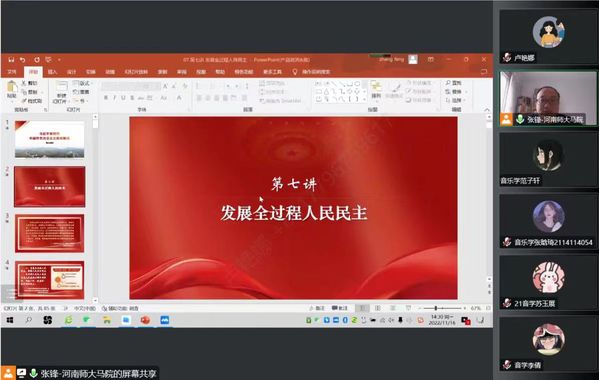 根据省委教育工委、教育厅关于思政课秋季学期“大听课”、“大调研”活动安排,11月16号下午,第七调研组对我校思政课进行了线上听课调研。第七调研组组长、河南科技大学马院院长刘振江,郑州大学蒋桂芳,黄河科技学院吕春燕,洛阳师范学院张体参加听课调研。