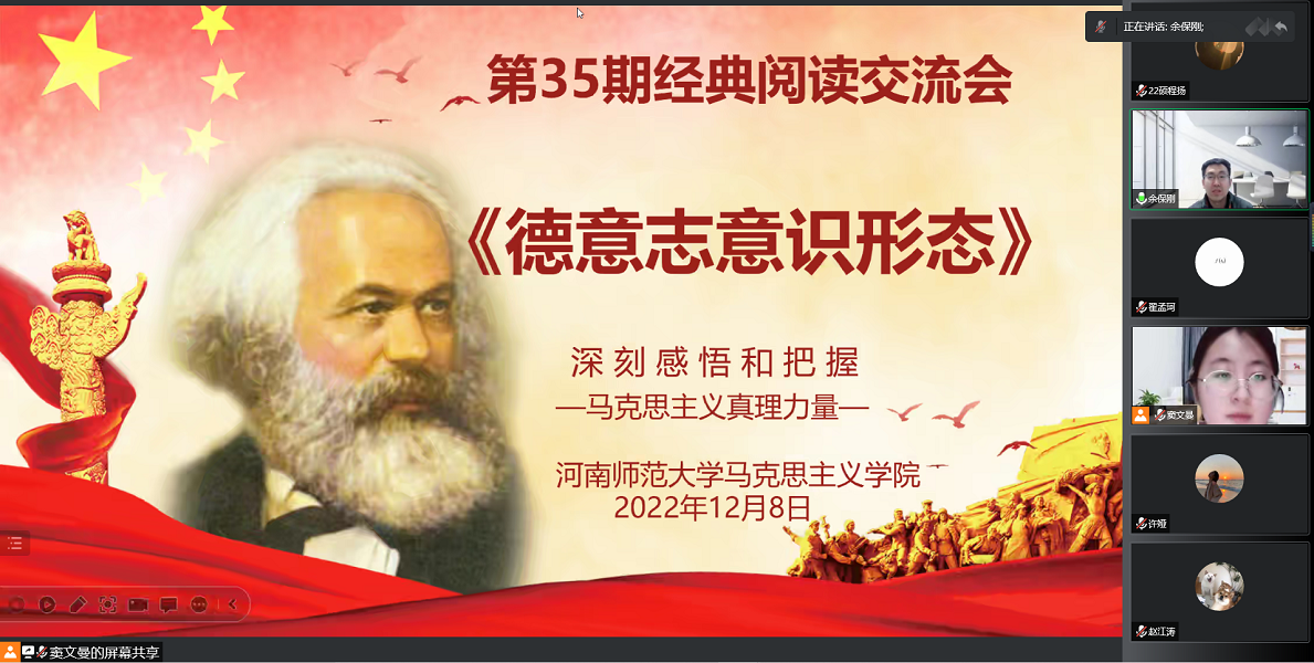 为夯实马克思主义理论基础,强化专业素养,12月8日下午,马克思主义学院举办第35期经典阅读交流会。本次交流会,我们邀请到马克思主义学院副院长余保刚教授作指导。会议以线上的形式展开,马克思主义学院硕博研究生、本科生代表参与本次活动,本次活动由2022级马理论研究生窦文曼主持。