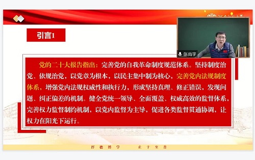 张尚字从新时代党的建设总体要求入手,以党的二十大提出的“完善党的自我革命制度规范体系”为主要内容,对“党内法规学的创建与发展展望”“依规治党相关理论问题”“‘1+4’党内法规体系解读”“党内法规的制定和运行”四大部分进行了详细阐释。他首先对“党内法规概念的历史演变”“党内法规与相关概念辨析”“新时代的党内法规体系建设”“十八大以来党内法规体系建设成就”进行了梳理,随后从“制度治党到依规治党”“依规治党是依法执政的题中之义”“坚持依规治党和依法治国有机统一”“坚持依规治党和以德治党相统一”四个方面深入浅出地诠释了党的二十大报告中指出的“坚持制度治党、依规治党”的核心要义和价值内涵。最后,他通过对党章、党的组织法规、党的领导法规、党的自身建设法规、党的监督保障法规内涵和外延的分类辨析和讲解,深入解读了新时代党内法规的制度体系和逻辑构成。