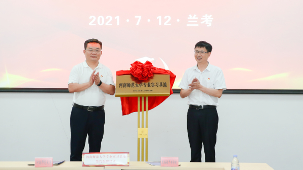 在焦裕禄干部学院专业实习基地签约挂牌仪式上,席建设首先致辞,他从师资队伍、培训规模、管理制度等方面介绍了焦裕禄干部学院的基本情况。张尚字围绕着近年来学校在省部共建、“111”基地建设、一级学科博士点申报、国家级和省级一流本科专业建设四个方面的重大突破介绍了学校的整体办学情况。他希望双方携手深挖红色资源、传承红色基因,在教学科研、干部培训、人才培养等方面积极合作交流,引领大学生更好地传承弘扬焦裕禄精神。双方负责人签订了《河南师范大学专业实习基地建设协议书》,张尚字与席建设共同为“河南师范大学专业实习基地”揭牌。