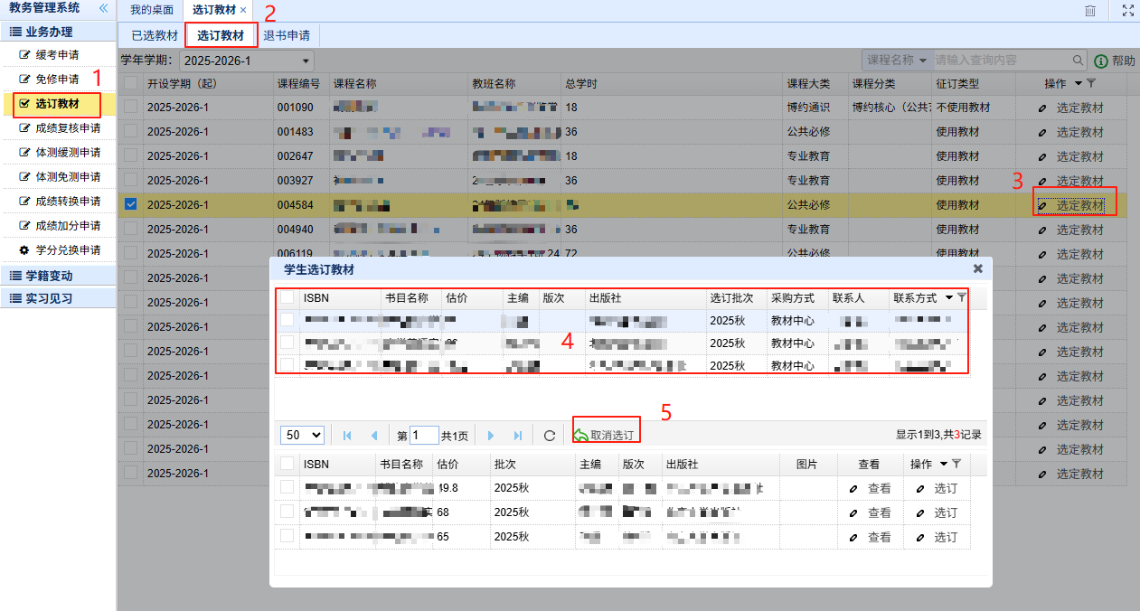退订流程:进入教务系统→选择业务办理→选定教材→选定教材标签→选择对应课程的选定教材→选择要退选的书→选择取消选订。