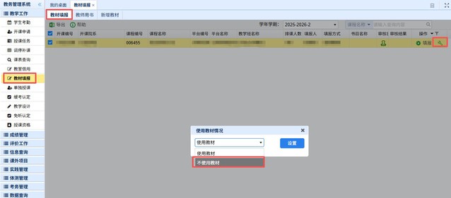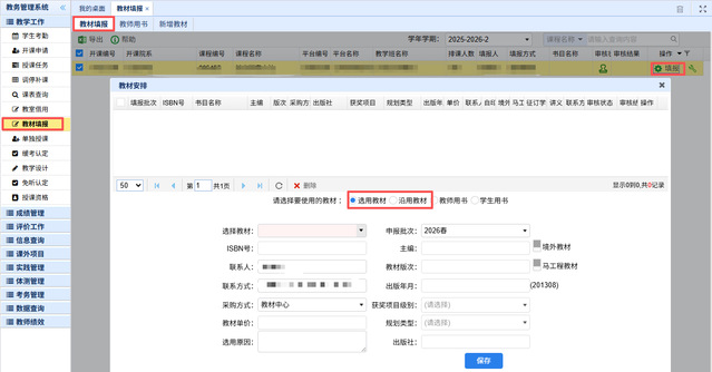 (二)教材填报。登录教务系统→点击“个人事务”→点击“教材填报”→找到对应的课程→点击“填报图标”→进入填报界面。填报时可选择“选用教材”,或“沿用教材”。如教务系统中无可用教材,需填写“新增教材”,提交审核通过后,方可进行教材填报。