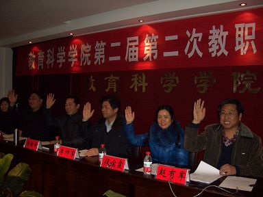 会议以举手表决的表决的方式通过了院长工作报告和福利慰问制度,最后由段宝霞副院长宣读《教育科学学院召开第二届第二次教职工代表代表大会》大会决议。