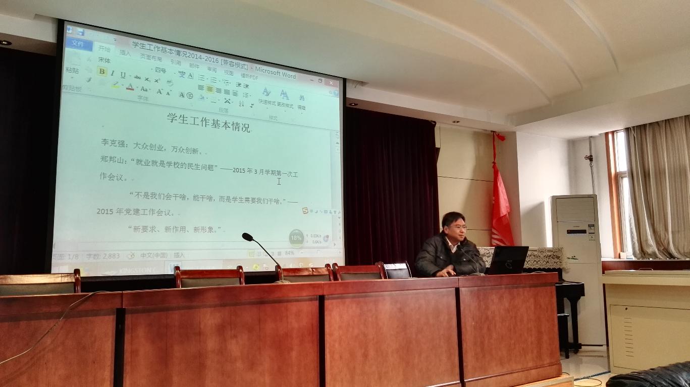 赵有军副书记从基本情况、存在的困难和问题以及今后工作的设想和思路几个方面对我院学生工作进行了整体介绍,指出我院的学生工作存在情况复杂多样、就业压力大等问题,今后一段时间,我院学生工作仍将紧紧围绕“明主题,建队伍,强抓点,搭平台,为学生终身发展奠基础”这一总思路,为学生成长成才做好管理服务工作。