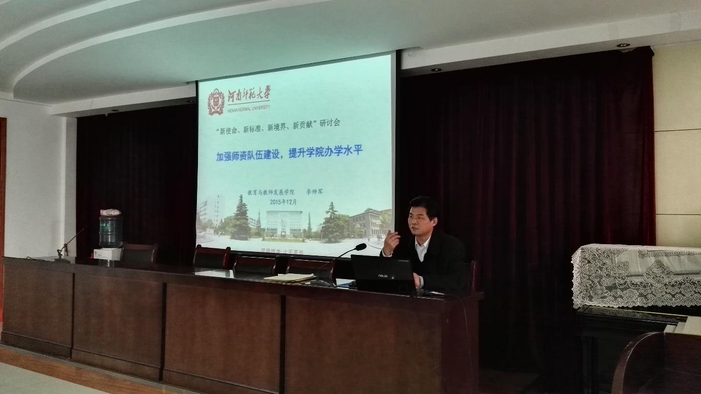 李帅军院长的报告以“加强师资队伍建设,提升学院办学水平”为主题,从师资队伍建设在学校和学院事业发展中的地位和作用入手,介绍了我院师资队伍建设的现状和已取得成绩,同时也指出尚存在的诸多问题。李院长强调,我院要根据学校的办学定位和办学特色,坚持以人为本,深化教师教育改革,采取有效措施,大力加强师资队伍建设,培养一支能够集培养、培训、研究与服务为一体的高效、实用的师资队伍。