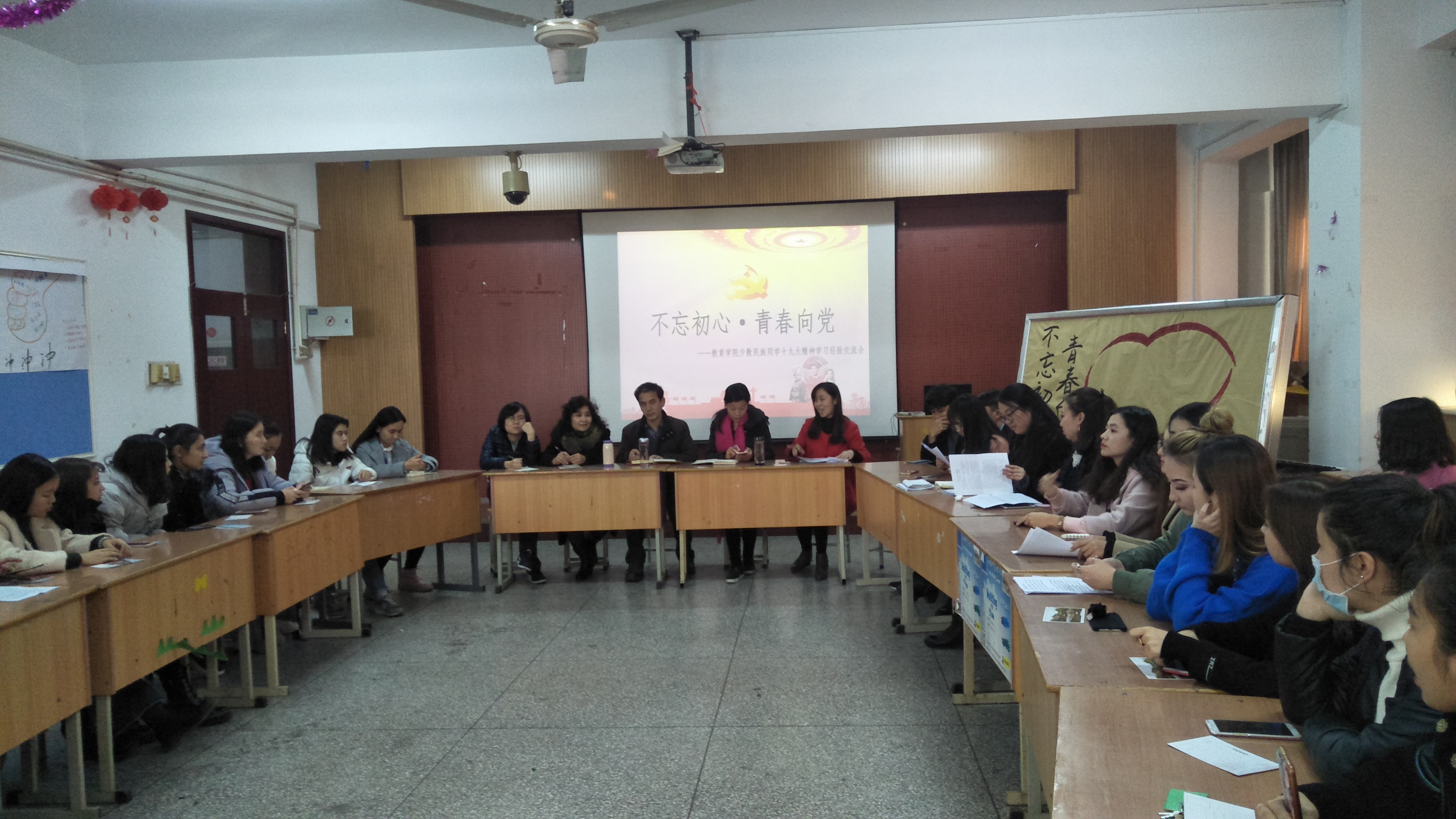 会议伊始,孙小文宣读十九大报告精神及关于少数民族政策支持方面的理论知识。新疆内派教师买尼瓦尔和茹先古丽先后指出,要准确领会并把握十九大报告中的一系列新思想、新论断、新提法、新举措,在学懂、弄通、做实上多下功夫,在今后的学习和工作中要不忘初心,砥砺前行。与会少数民族学生代表先后发言,分享自己对十九大精神的学习感悟。2017级学前教育专业罗丽首先对习近平总书记持续三小时的报告表示敬佩,总书记不骄不躁的态度为无数年轻人树立了一道标杆,她还表示作为青年大学生的我们肩负历史重任,应在今后的学习生活中严格要求自己。2016级教育技术学专业再衣热·斯坦旦认为广大青年在新时代发展中应该顺应时代呼唤,在火热的青春中放飞人生梦想,在拼搏的青春中成就事业华章。