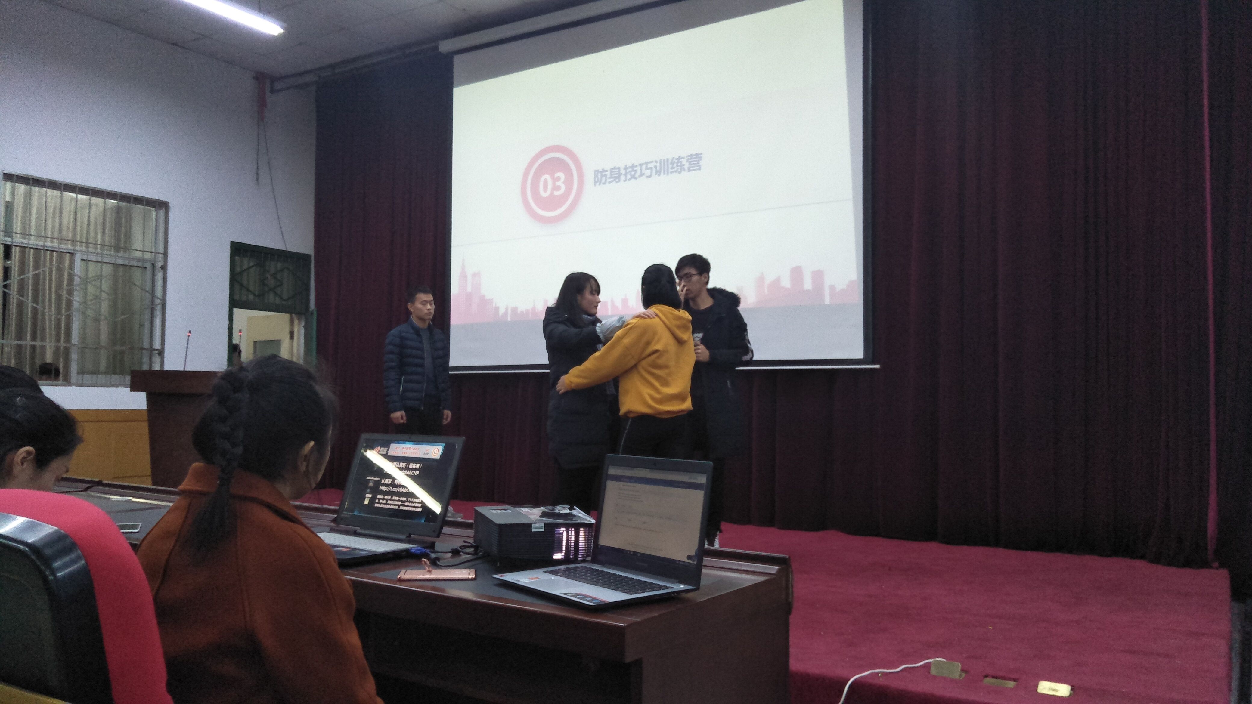 主持人通过介绍发生在大家身边的真实事例表明安全的重要性,引起现场同学共鸣,尤其是前段时间发生的女寝偷拍事件,令在场女生为之嗟叹。保卫处任荣杰详细给同学们讲述了火灾的成因、火灾发生时应当如何做以及如何使用灭火器等问题,并亲自演示,教给大家操作方法和注意事项。校武术协会代表还现场教授女子防身术的动作要领,让大家更快、更好地学习防身技巧,远离危险。