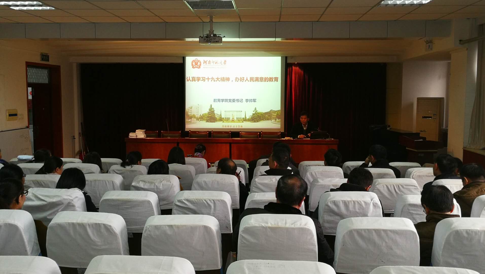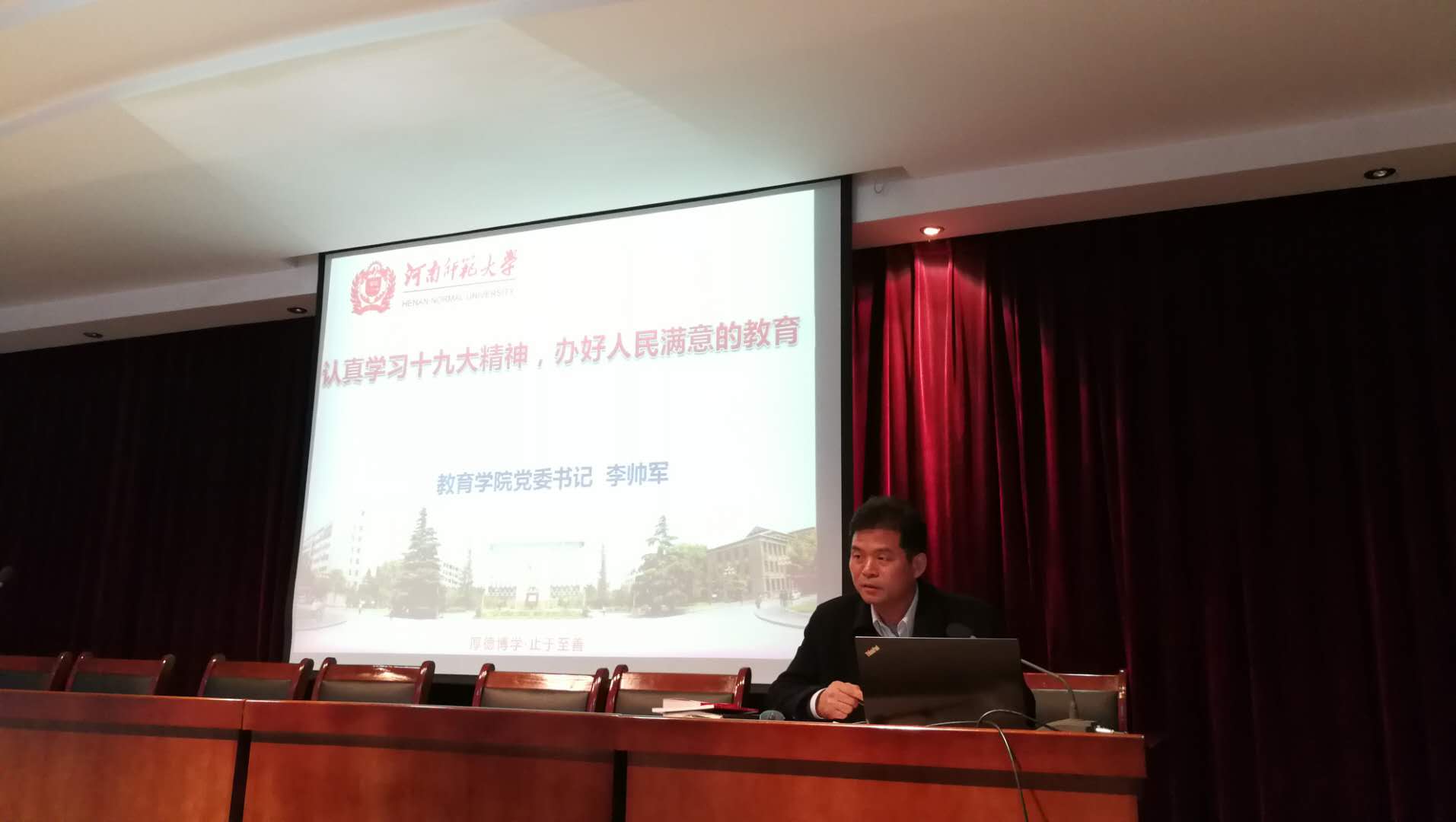 为深入学习贯彻党的十九大精神,12月12日,教育学院在田家炳813室开展了以“认真学习十九大,办人民满意的教育”为主题的专题党课活动,院党委书记李帅军担任主讲。