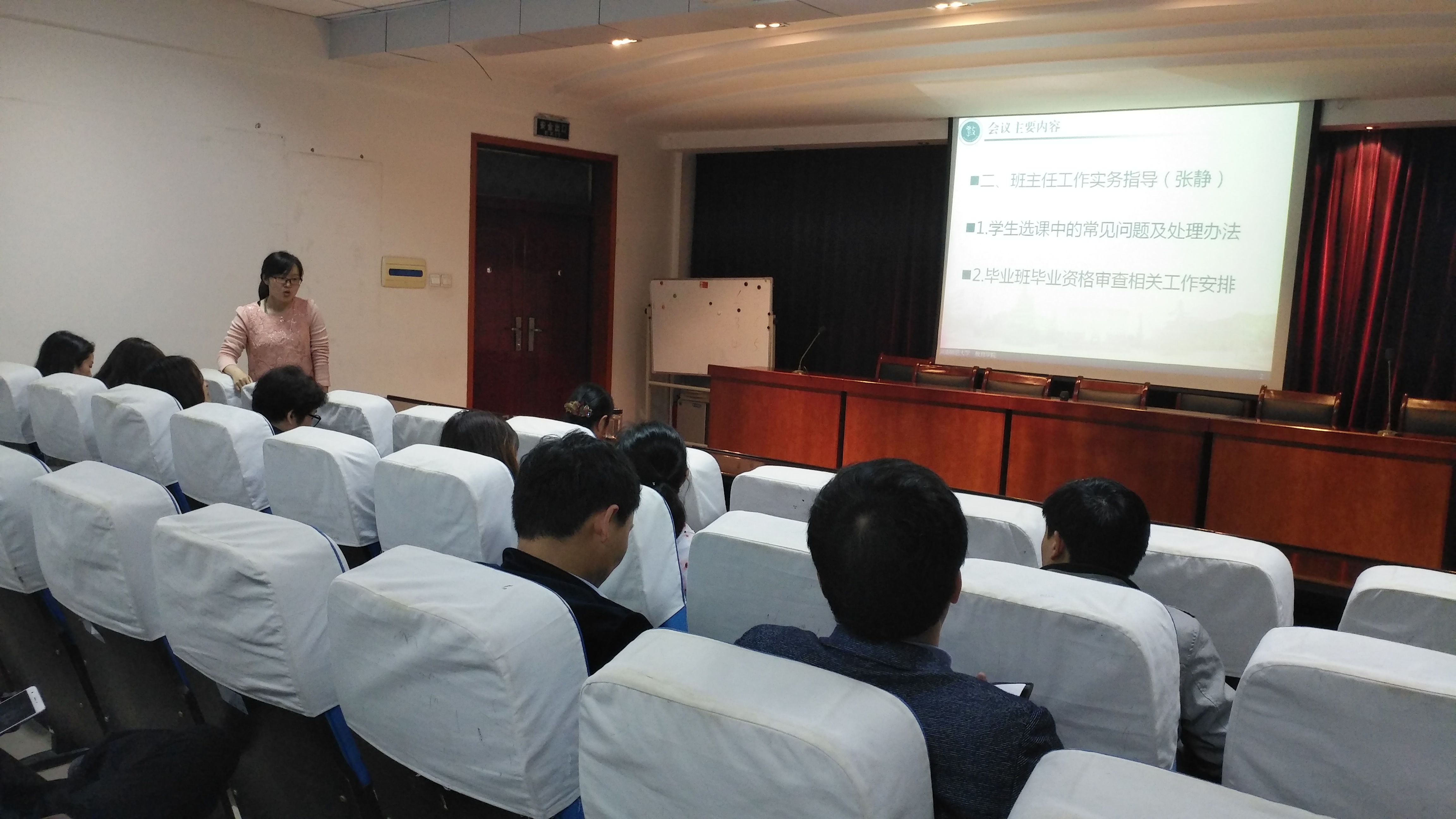 教务办公室张静老师详细介绍了学分制背景下本科生选课的相关要求和学生在选课中的常见问题及处理办法并对毕业生资格审查工作进行具体安排。与会班主任老师纷纷结合实际工作经验展开讨论,介绍自己的工作思路,并就如何做好相关工作提出积极建议。