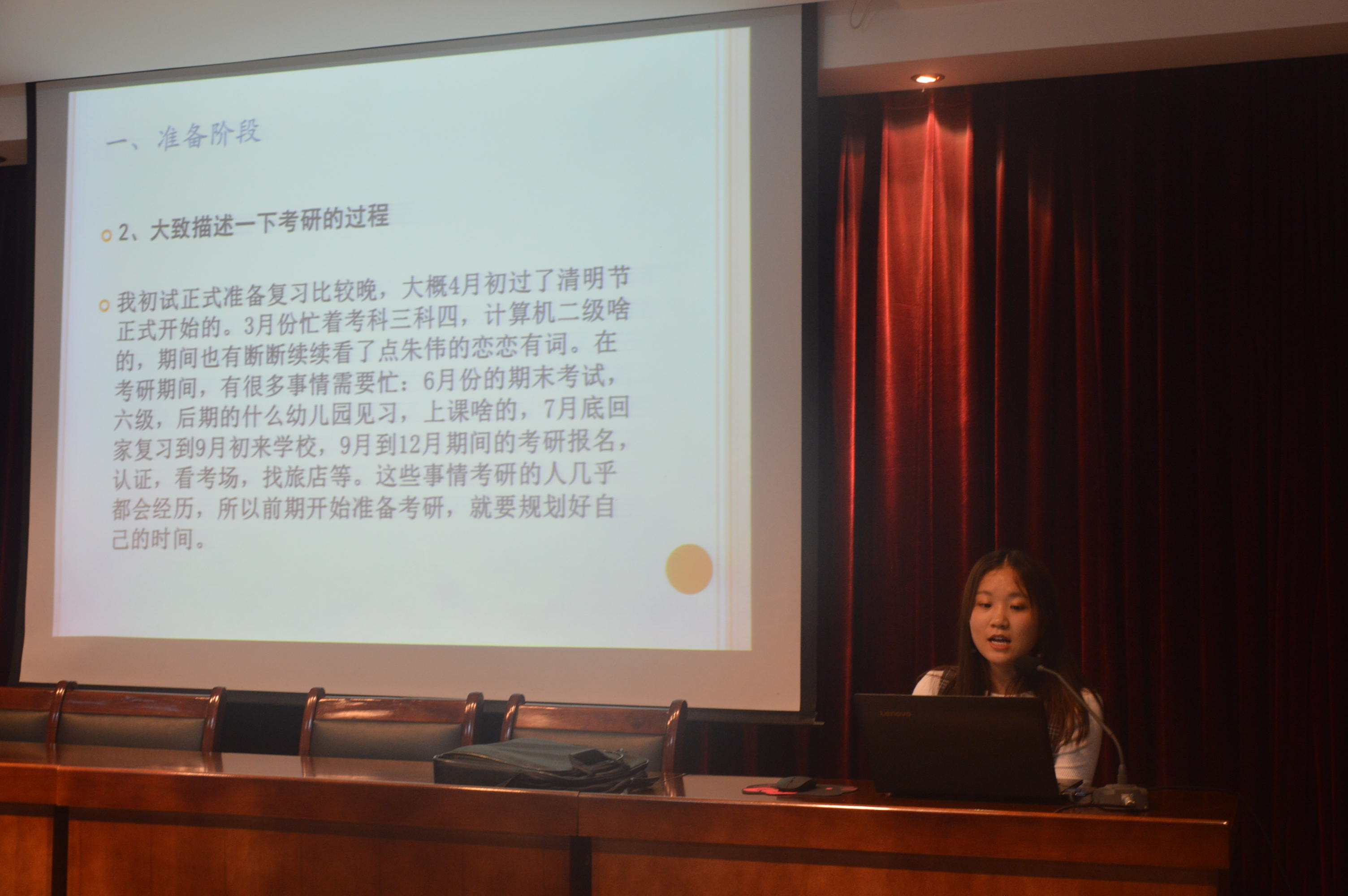 4月23日,我院学前教育专业于田家炳812开展了考研分享交流会。2014级学生代表受邀分享考研经验,2015级兼职辅导员周成玉参与此次活动,2015级部分学生参与了本次活动。