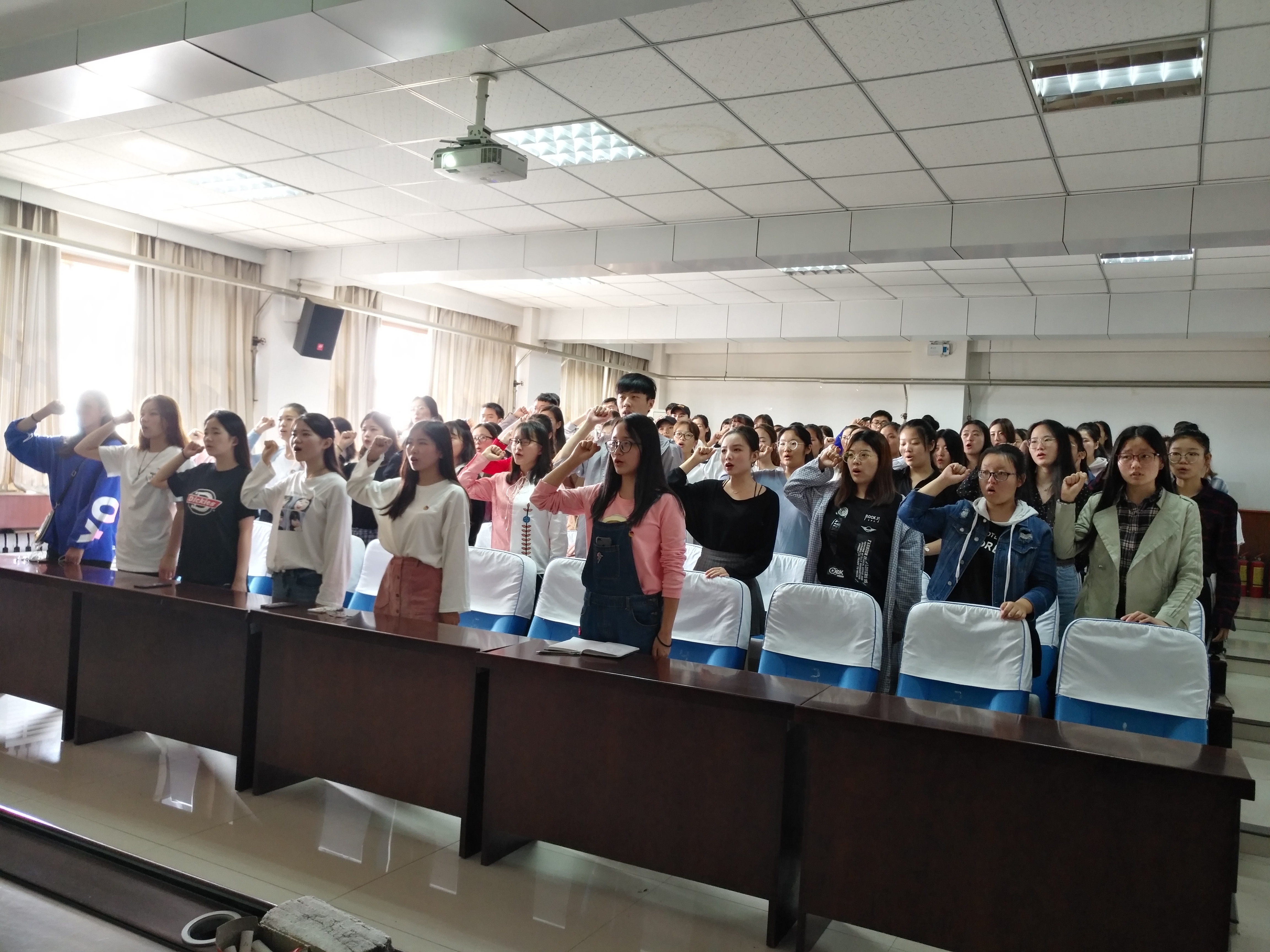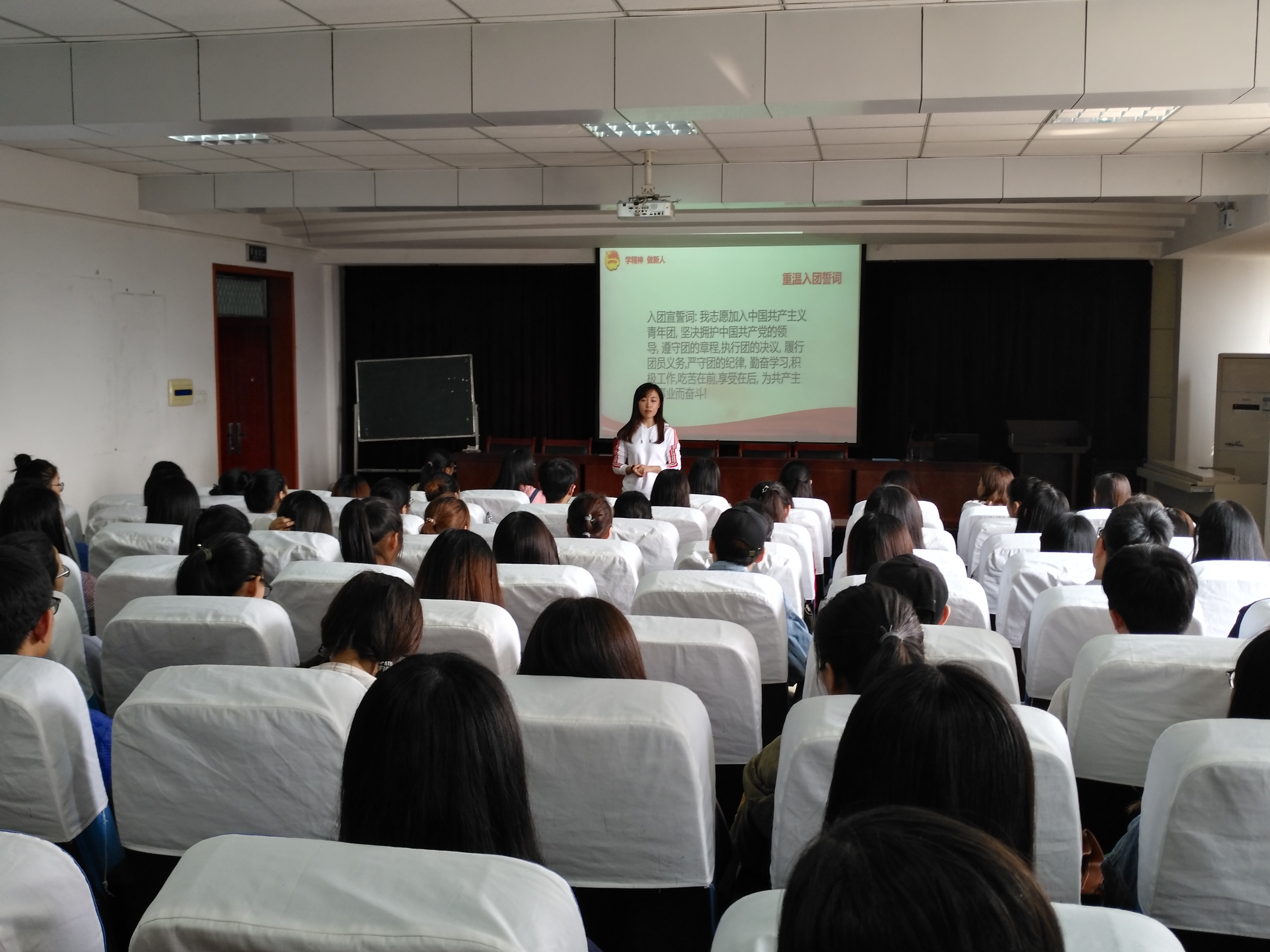 活动伊始,全体团员进行宣誓、重温誓词。宣誓后,孙老师对团十八大精神内容以及团十八大的主题进行重点讲解,她提出同学们要理解并牢记习近平总书记所说的“扣好人生第一粒扣子”、“青春是用来奋斗的”等重要话语,在场学生都认真聆听并做好记录。此外,孙老师强调每一个团员都要有角色意识,尽力做好自己的主责、主业。最后,孙老师告诫大家要将团十八大的精神真正落实到实际行动中,不断鞭策自己成为有责任、有担当的青年。