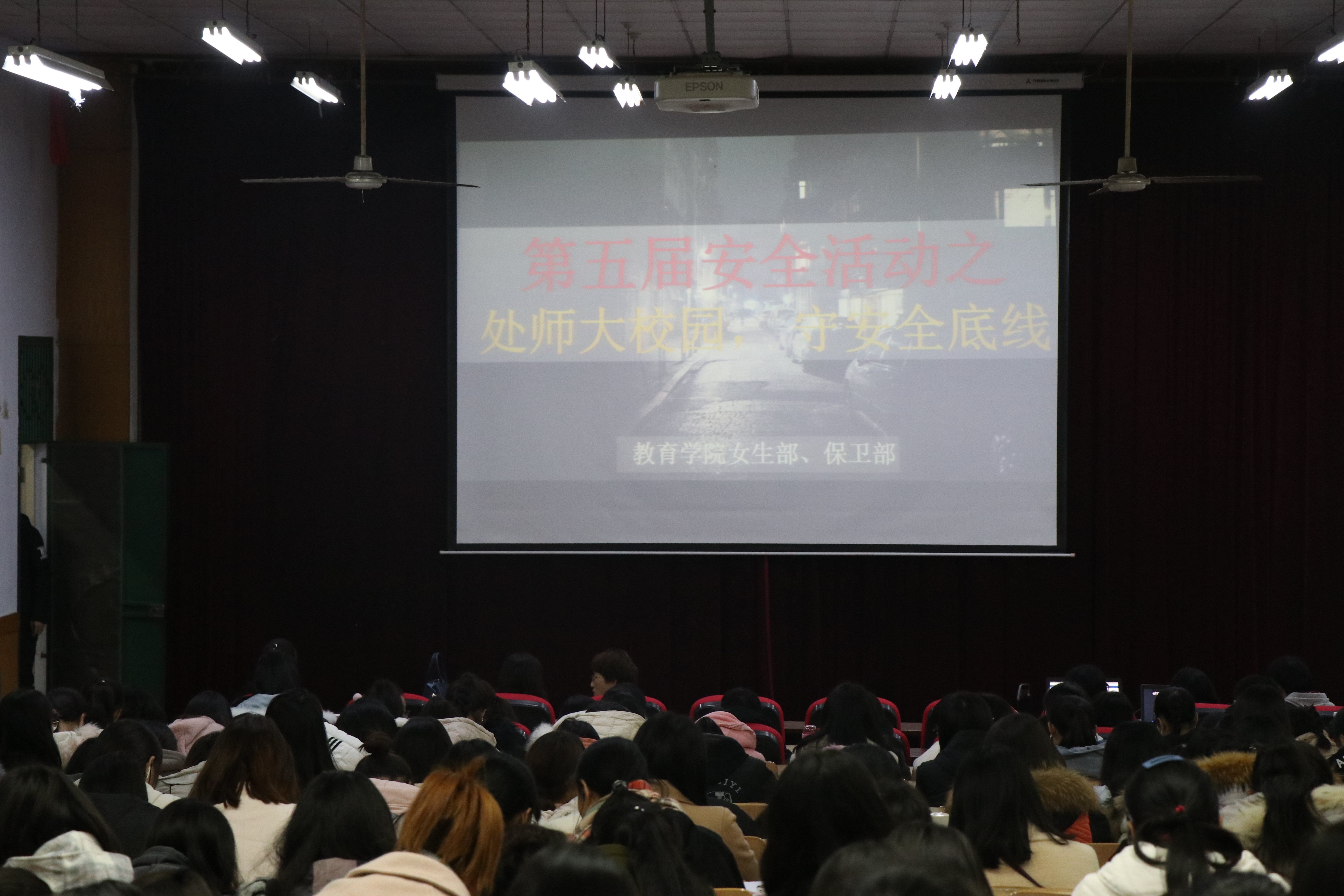 121日,由教育学部团委举办的第五届安全知识讲座之“处师大校园,守安全底线”活动于多功能报告厅开讲。校保卫处政保科科长刘茜茜、教育学部党委副书记康淑霞、团委书记孙小文应邀出席。