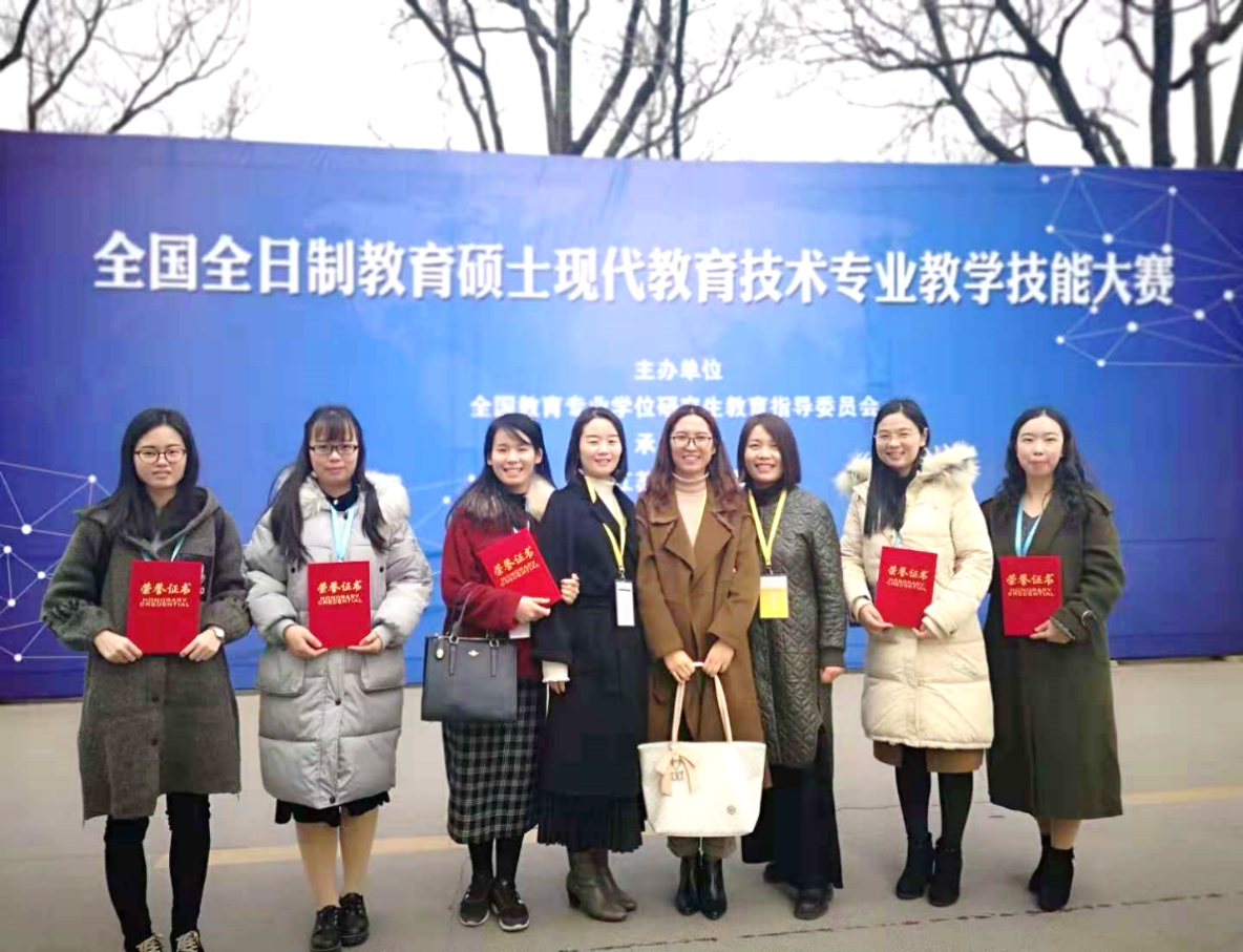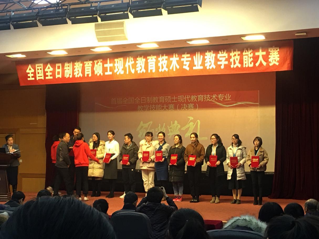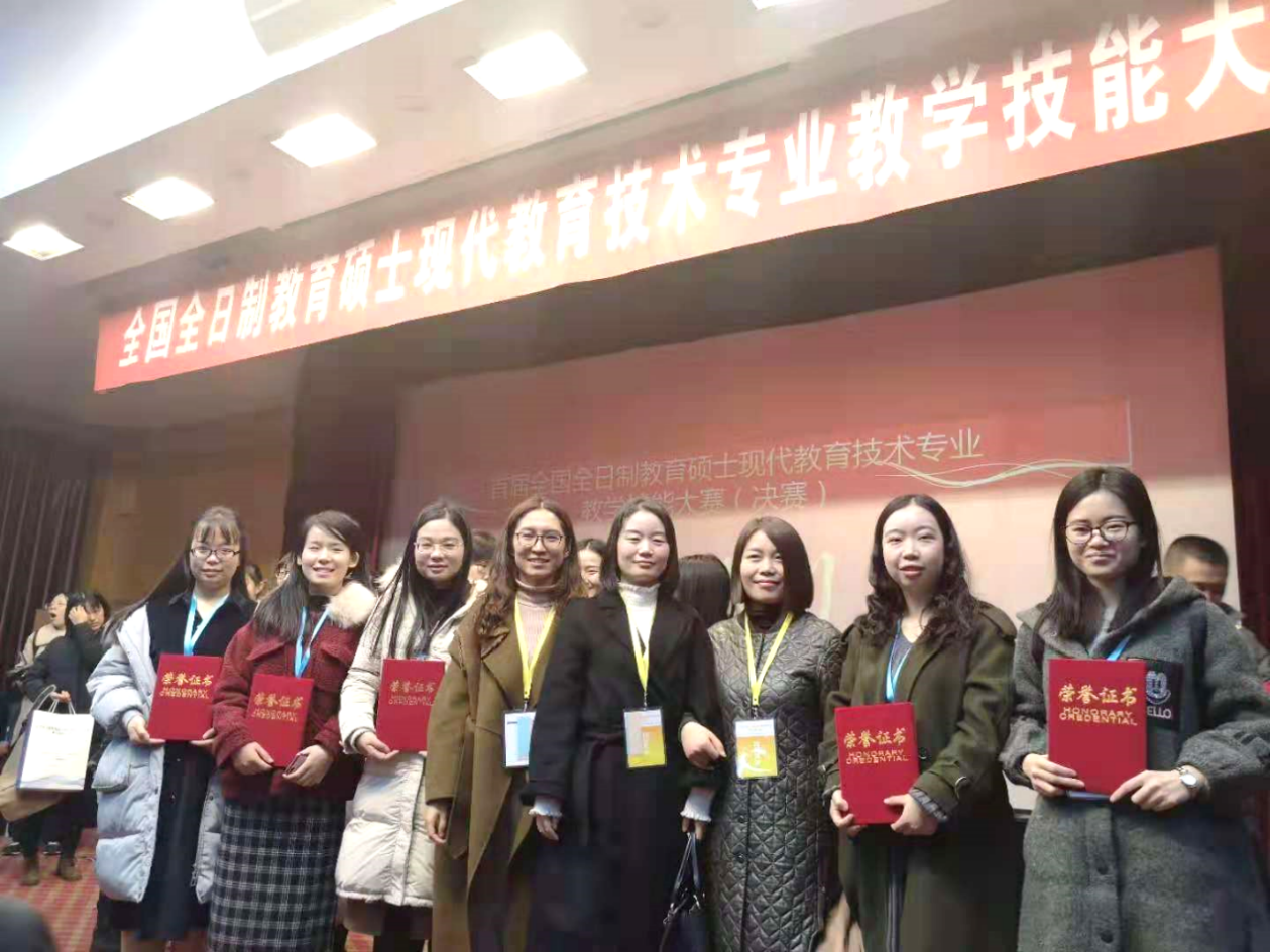 2018年12月8日,首届全国全日制教育硕士现代教育技术专业教学技能大赛在江苏师范大学举行。我校教育学院现代教育技术专业型硕士参赛的5名研究生全部凭借出色的表现获得佳绩。其中,屈静同学荣获二等奖,李冰、李倩楠、闫佳惠和杨扬等四位同学获得三等奖(一、二、三等奖的获奖比例分别是10%、20%、30%),我校参赛学生的整体获奖率名列前茅,教育学院教育技术学系卜彩丽老师荣获大赛组委会颁发的优秀指导教师奖。