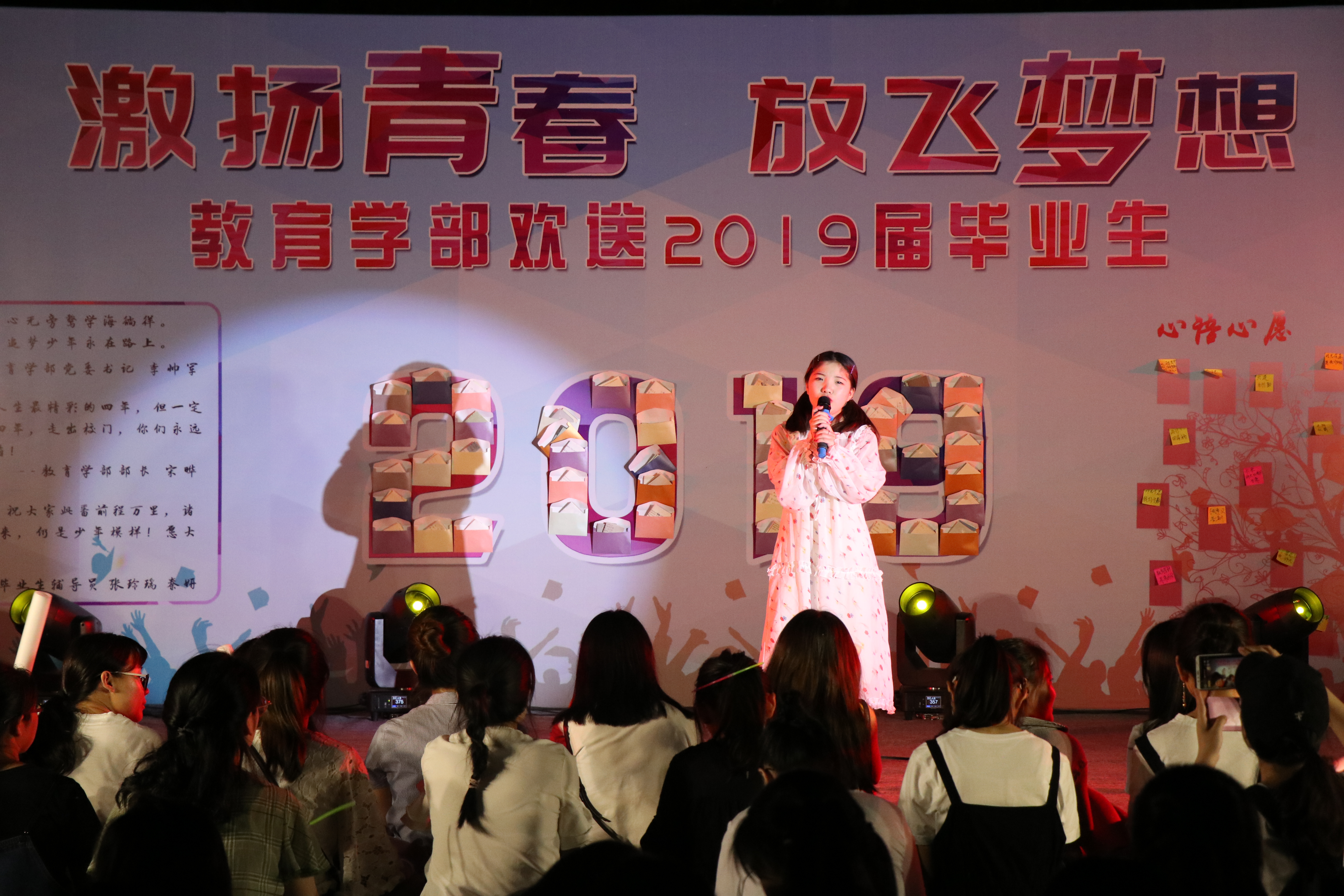 首先,歌会在四人舞串烧的热烈氛围中火热开场;随后,《送别》、《老男孩》《岁月神偷》等一系列歌曲轮番登场,音律优美,其中,卢雅茹带来的歌曲《她说》,音质轻灵,余音绕梁,现场观众深深沉浸于其中;紧接着,歌会进入互动环节——说说心里话,主持人从身后的喷绘墙上随机抽取学弟学妹为毕业生们写下的祝福,并现场朗读:相逢是首歌,一艘艘航船在师大邂逅,迎风而立。随之,王子璇愿我们都是自己的《关键词》、樊富强带着我们回忆了《那些年》,句句声入人心,激起了毕业生心中的美好回忆;最后,2019届毕业生从喷绘墙上随机领取学弟学妹的写下的祝福并在心愿墙上写下感言。至此,教育学部欢送2019届毕业歌会圆满结束。