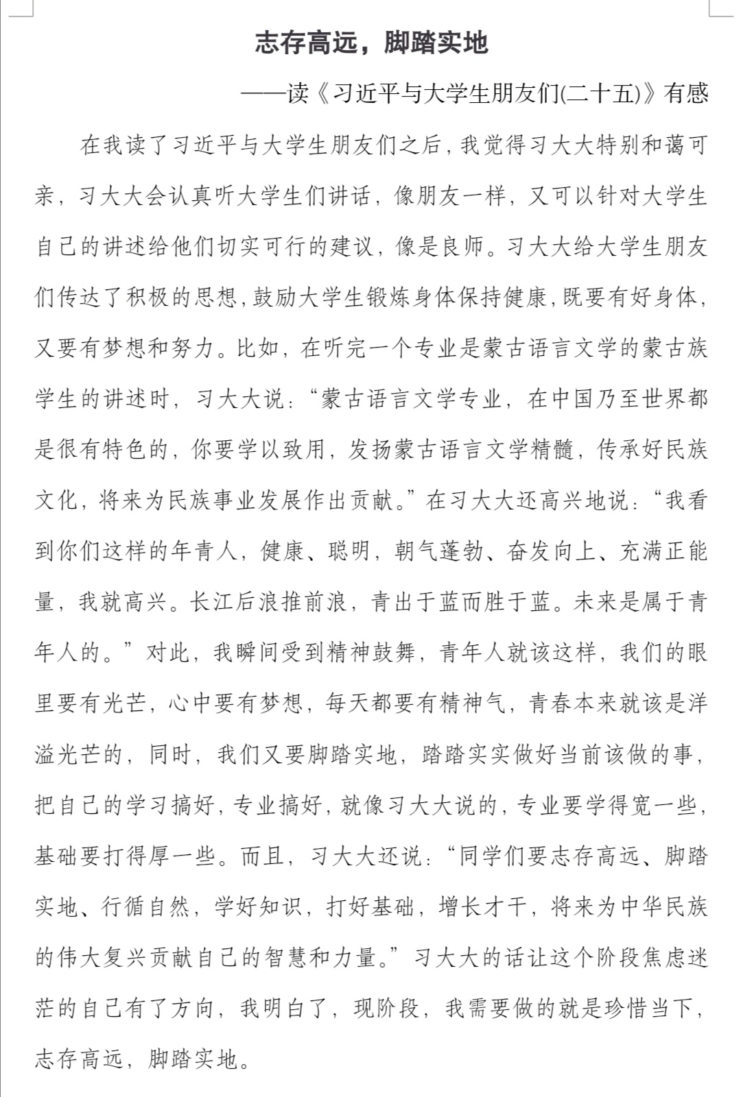 同学们认真学习习近平总书记对大学生的勉励,深刻领会青年学生的担当与使命,并撰写了学习心得体会。2018级李菲菲在感悟中谈到,作为一名学生干部,要努力做好自己的本职工作,在平时的工作中遇到挫折是不可避免的,但自己时刻牢记习近平总书记的话:“千里之行,始于足下,要做那些可能做、可以做的事,要忌‘急’,不能急于求成。”转化视角,将小事放入大局之中,奉献自己的青春力量。2019级心理学专业王雅琪表示,在读到习总书记对大学生的劝诫与忠告之后,更感受到了新时代大学生所担负的责任与义务,青年学子当不负时代重托,奋力前行。思想上树立起为中华民族伟大复兴贡献力量的决心与斗志,学习上脚踏实地,认真刻苦,不断丰富自身知识储备。