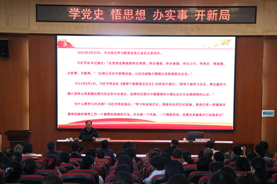 梅宪宾以《党史与党的理论创新》为题,主要从我党历史上学习党史的第一个高峰、深刻领会习近平新时代中国特色社会主义思想、深刻领会我国社会主要矛盾的变化、习近平新时代分两步走发展战略、关于全面从严治党、启示与感悟等六个维度展开宣讲,系统阐述了党史的研究对象、目的、研究方法、阶段划分等问题,深情回望了波澜壮阔的百年党史以及党的理论创新;他通过详实的史料故事和伟人诗词、书信等,激发大家学好党史、用好党史、讲好党史,从党史中汲取智慧与力量,切实把学习教育成效转化为立德树人的实际行动,努力推动学校事业创新与发展。