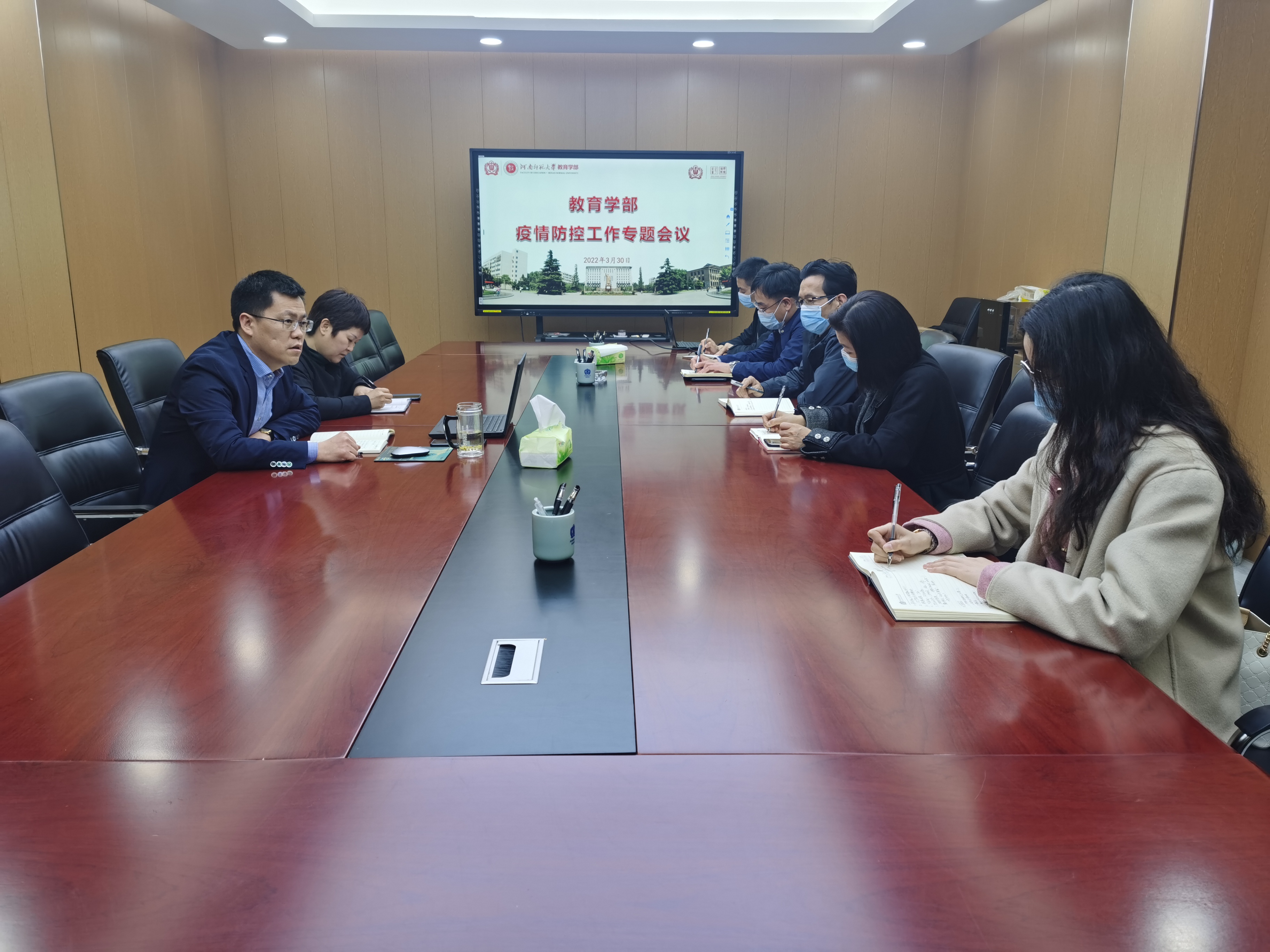 3月30日晚21:00,教育学部在田家炳教育书院801会议室召开疫情防控工作专题会议,对学校各项最新部署进行学习与落实,学部领导班子成员和疫情防控领导小组成员通过线上线下相结合的方式参加会议。会议由学部党委书记陈勇主持。