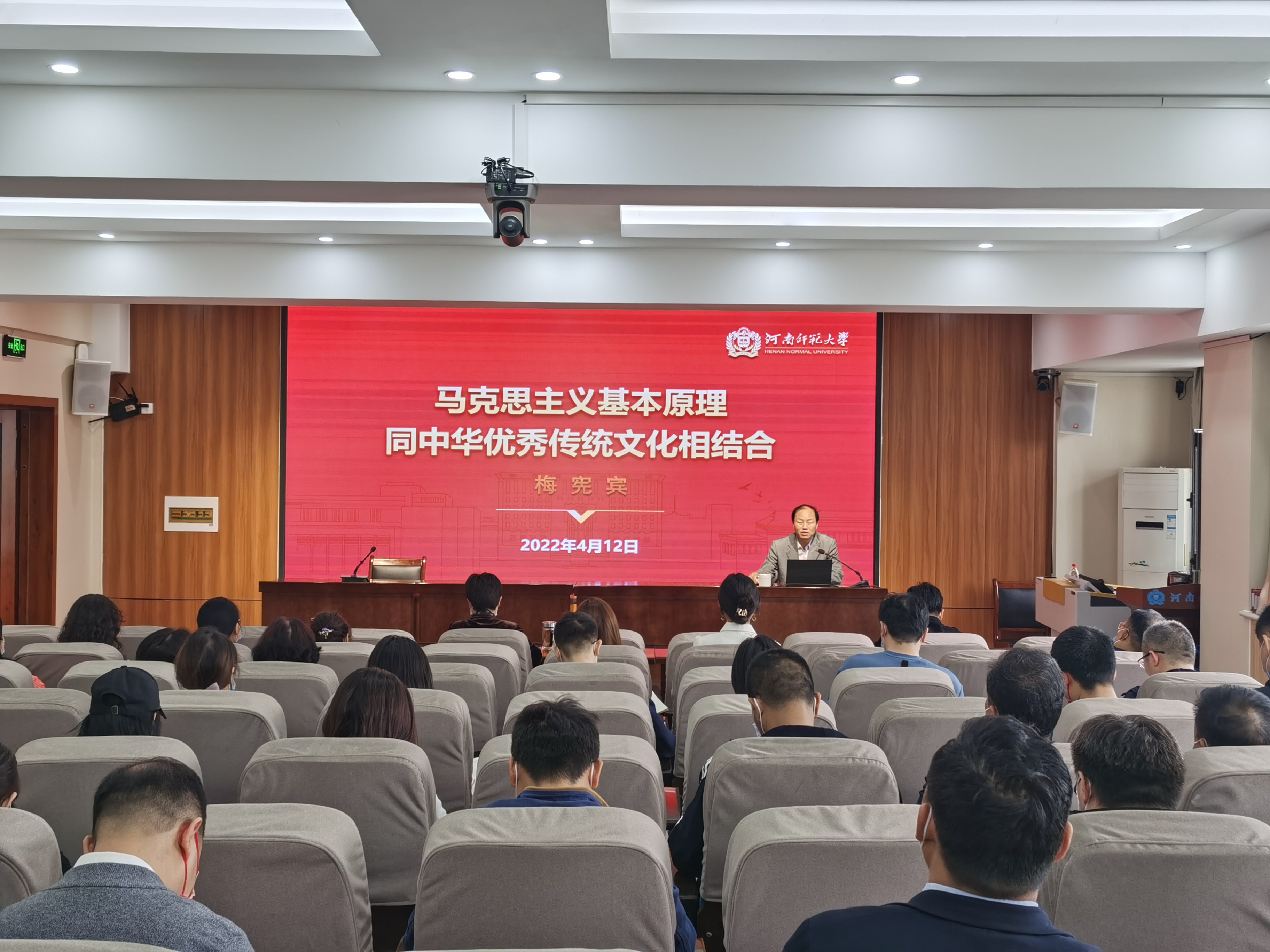 梅宪宾以“马克思主义基本原理同中华优秀传统文化相结合”为题,从重要意义、概念界定、原理表述、结合观点、结合的要素、与自然科学相区别、借鉴世界其他文明和结论八个方面,详细阐述了马克思主义基本原理、中华优秀传统文化、与马克思主义基本原理相结合、文化与文明等基本概念,解读了马克思主义基本原理与中华优秀传统文化为什么要结合,两者能不能结合,以及结合该采取什么样的措施。他强调,马克思主义是中国共产党人理想信念的灵魂,中华优秀传统文化是中华民族的根和魂;“相结合”将在新时代不断开辟马克思主义新境界;“中华优秀传统文化”滋养社会主义核心价值观,培育社会伦理道德,定型完美人格;这对增加习近平新时代中国特色社会主义思想的中华优秀传统文化成分,“继续发展当代中国马克思主义、21世纪马克思主义”,具有十分重要的意义。