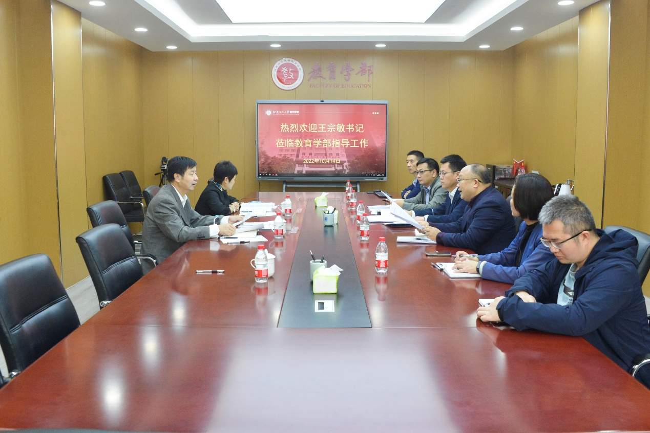 王宗敏首先听取了教育学部负责人关于《河南省义务教育优质均衡发展监测方案》制定情况汇报,详细了解项目总体设计、目标任务和进展情况,并就项目顶层设计、核心任务和具体执行等问题提出了指导意见。王宗敏指出,开展河南省义务教育优质均衡发展监测工作是省委、省政府为深入推进义务教育优质均衡发展,进一步缩小区域、城乡、校际差距做出的重要部署,也是我校发挥人才优势,服务地方经济社会发展和我省重大战略的重要抓手,在前期工作基础上要成立工作专班,精心谋划、细化方案、高效推进,确保项目顺利实施。