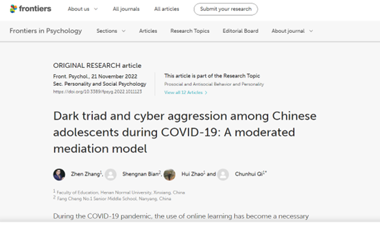 11. 张振等.Dark triad and cyber aggression among Chinese adolescents during COVID-19: A moderated mediation model Frontiers in Psychology 2022-11-21