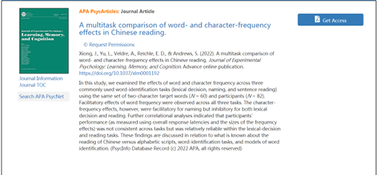 12.熊建萍等.A multitask comparison of word- and character-frequency effects in Chinese reading.Journal of Experimental Psychology : Learning, Memory, and Cognition:2022(11):1-19