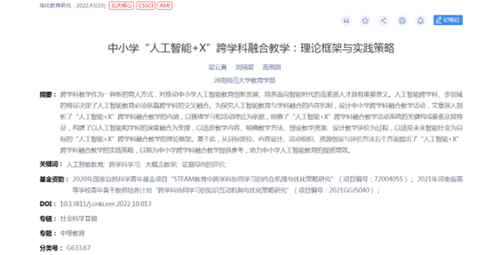 4. 梁云真,刘瑞星,高思圆. 中小学“人工智能+X”跨学科融合教学:理论框架与实践策略[J]. 电化教育研究,2022,43(10):94-101.