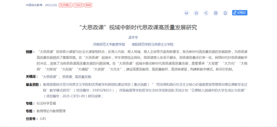 6. 孟冬冬. “大思政课”视域中新时代思政课高质量发展研究[J].中国电化教育,2022,(10):89-96.