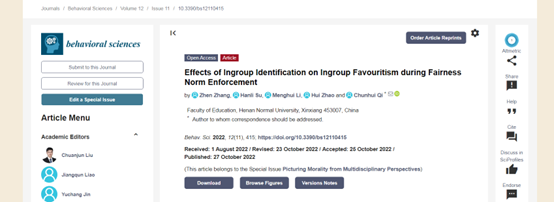 10. 张振等. Effects of Ingroup Identification on Ingroup Favouritism during Fairness Norm Enforcement. Behav. Sci. 2022, 12, 415.