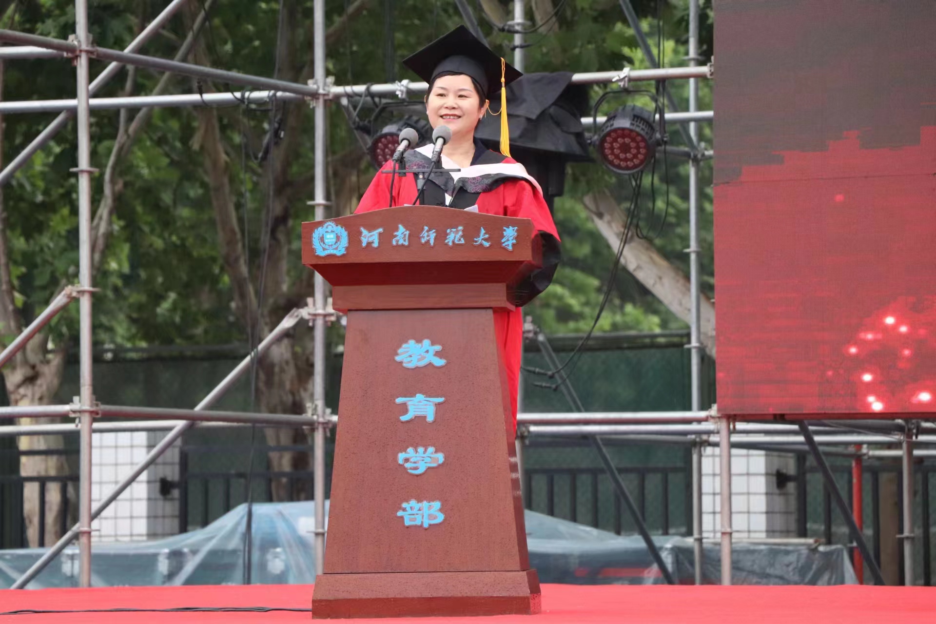 教育学部部长罗红艳教授代表学部向全体毕业生表示热烈祝贺,他回顾了近几年教育学部取得的各项成就,对毕业生的成长成才表示欣慰,同时也希望大家积极投身到祖国的建设之中,能够塑造良好的道德品格和保持学习的习惯,在“爬陡坡”“涉险滩”“攀绝壁”中,成为开路先锋、事业闯将,在新时代新征程上留下精彩的奋斗足迹。
