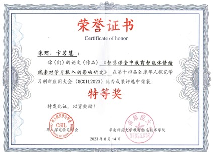 大会共收到学术论文220篇,案例作品120件。经过评审委员会初审、现场汇报复审等环节,最终评选出学术论文特等奖12篇,一等奖8篇,二等奖66篇。案例作品特等奖4件,一等奖16件,二等奖30件。教育学部积极组织师生参与学术成果展示交流,教师朱珂与硕士研究生卞茗慧合作提交的论文《智慧课堂中教育智能体情绪线索对学习投入的影响研究》荣获学术论文特等奖。另外,硕士研究生张晨雨等获得案例作品二等奖4项。