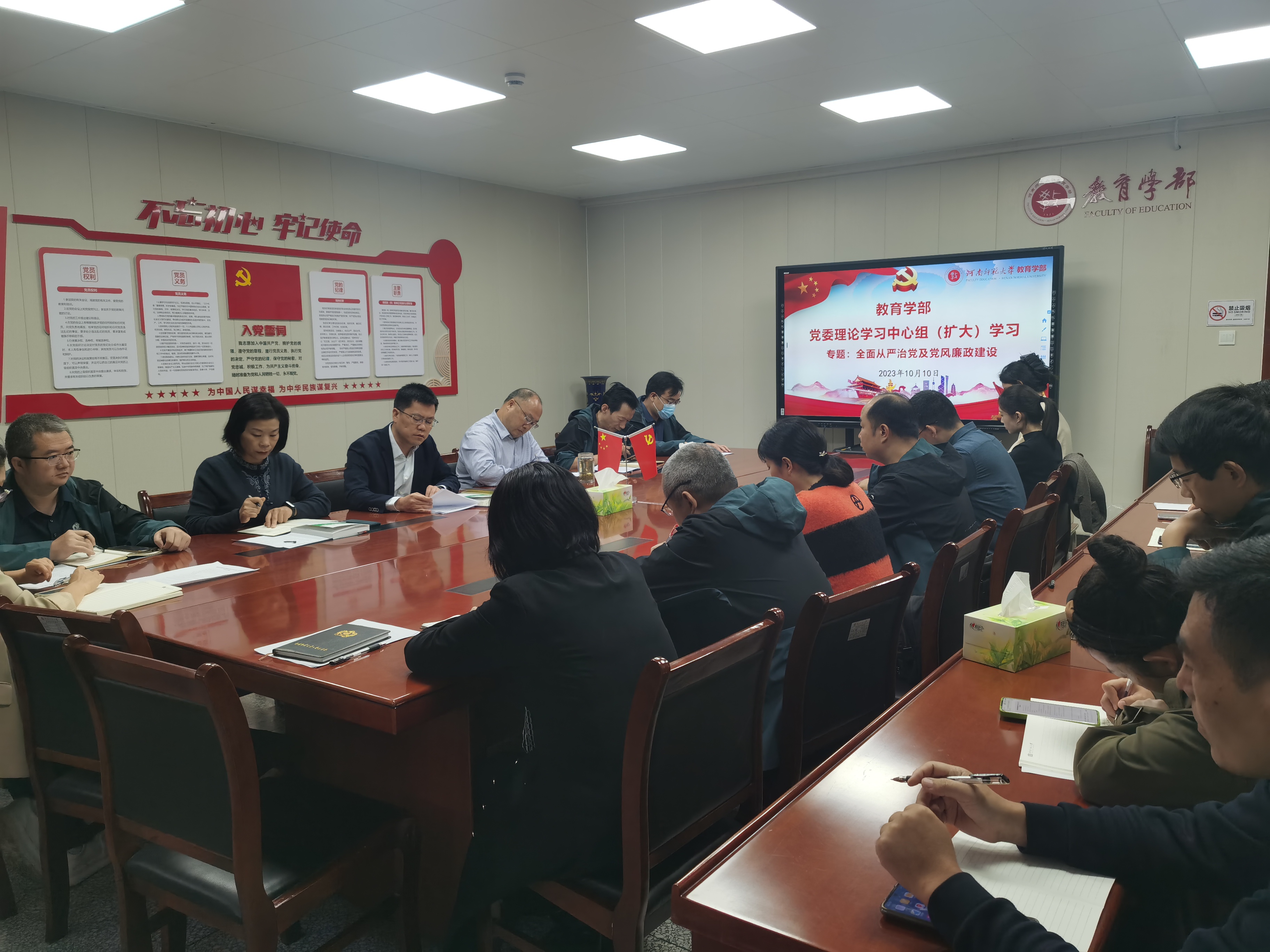 10月10日上午,教育学部在田家炳教育书院807党建活动会议室召开党委理论学习中心组(扩大)会议,专题学习全面从严治党及党风廉政建设。学部领导班子、党委委员、各党支部书记、全体科级干部和专职辅导员参加学习。会议由学部党委书记陈勇主持。