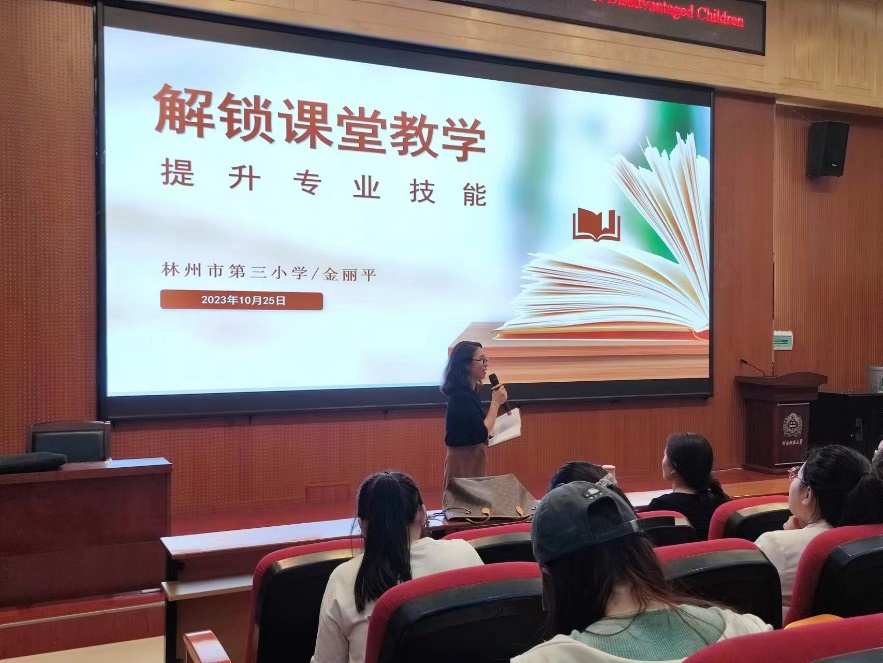 为深入学习习近平总书记关于教育强国的重要讲话精神,坚持培养高素质教育人才的政策引领,切实推进师范生应用技能水平提升,10月25日,林州市第三小学副校长、安阳市文明教师金丽平应教育学部邀请,为师范生作题为“解锁课堂教学,提升专业技能”的专题讲座。教育学部300余名师生共同聆听此次讲座,讲座由教育学部副部长卜彩丽主持。