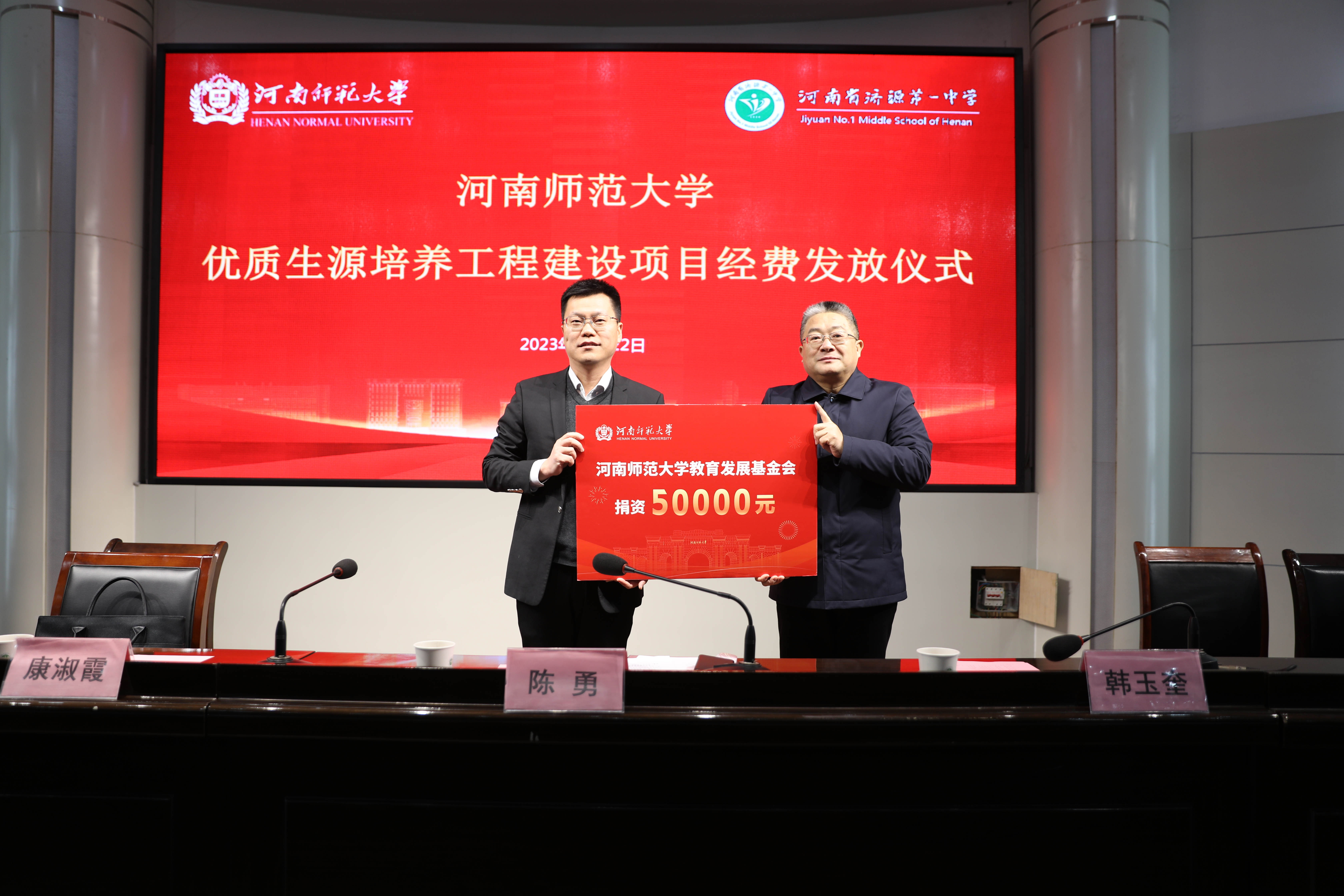 在济源一中,陈勇代表我校对济源一中长期以来向河南师范大学不断输送优秀生源表示感谢,他代表学校向济源一中发放“优质生源培养工程建设项目经费”5万元。济源第一中学党委书记、校长韩玉奎对陈勇一行的到来表示热烈欢迎,表示济源一中将以此次优质生源工程建设项目为契机,加强与河南师范大学的联系和合作,为师大输送更多优秀学子。发放仪式后,陈勇、康淑霞等与在济源一中工作的师大校友代表进行座谈交流;教育学部心理学重点学科秘书熊建萍教授在济源一中大讲堂为同学们带来《走进心理学》科普讲座。