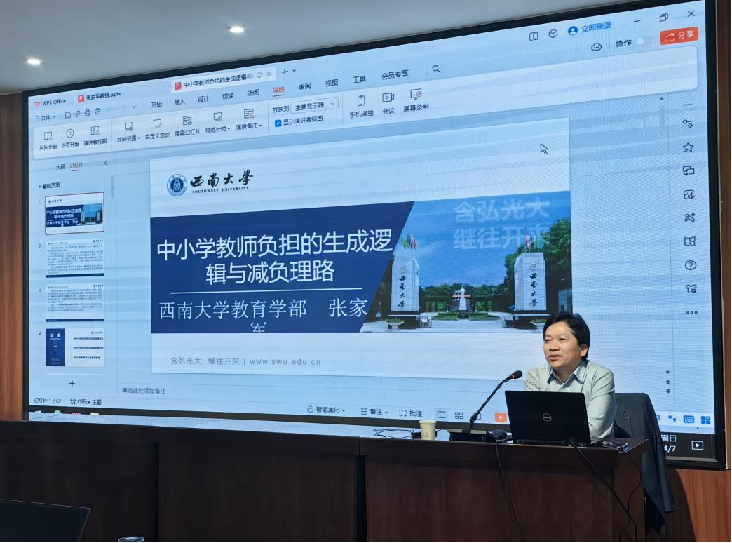 4月7日上午,应河南师范大学教育学部邀请,西南大学张家军教授,在田家炳教育书院819会议室作了“中小学教师负担的生成逻辑和减负理路”专题讲座。本次讲座由教育学部副部长苗学杰主持,百余名学部师生参与了学习。