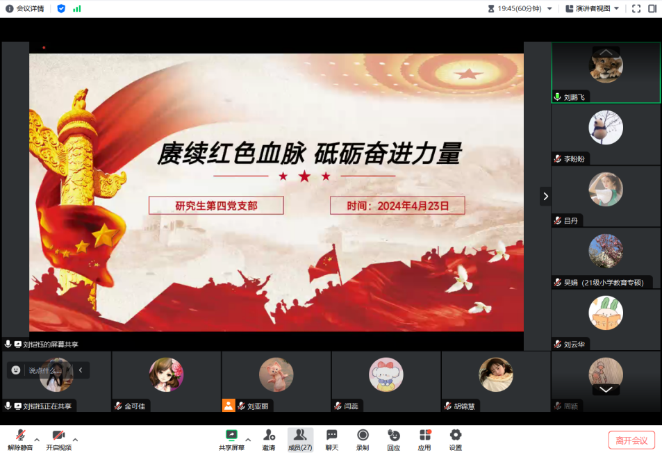 4月23日上午,教育学部研究生第四党支部在腾讯会议线上召开了以“赓续红色血脉,砥砺奋进力量”为主题的党日活动。由教育学部研究生第四党支部书记刘铠钰主持,教育学部研究生第四党支部全体党员和预备党员同志参加。