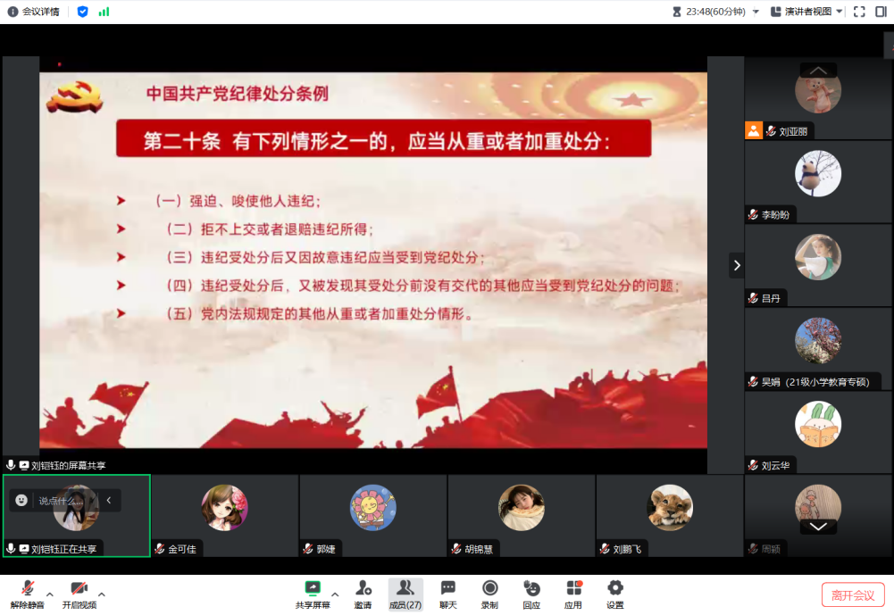 在进行主题活动的第二部分,支部书记刘铠钰同志为大家讲解中国共产党纪律处分条例,针对我们还未踏入社会的学生身份,和今后初入岗位的工作身份,重点说明与之相关的条例。刘铠钰同志结合例子,讲解深入浅出、通俗易懂,中国共产党纪律处分条例在各位党员同志心中留下了深刻的记忆。会上各位同志表示,一定会坚定政治立场,提高思想站位,谨慎言论。除此之外,预告大家后续将要进行的事项与时间安排,在整理毕业党员的档案材料时,提醒大家务必确保档案材料的完整性和真实性。最后,鼓励大家要深入、持续地进行学习,不断提高自身的思想政治觉悟。