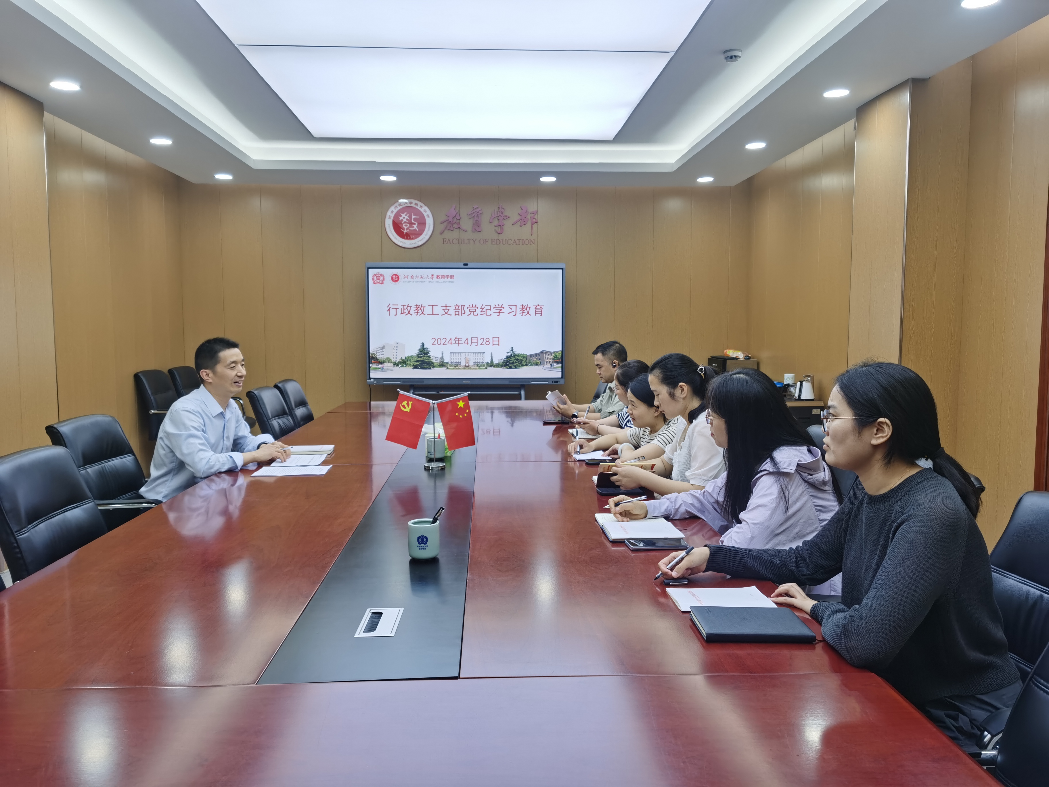 为深化党纪学习教育,强化纪律意识,确保每一位党员同志将党的纪律深刻于心,做到学纪、知纪、明纪、守纪,4月28日上午,教育学部行政教工党支部举行党纪学习教育主题党日活动。会议由行政教工党支部书记全金梁主持,全体党员参加此次活动。