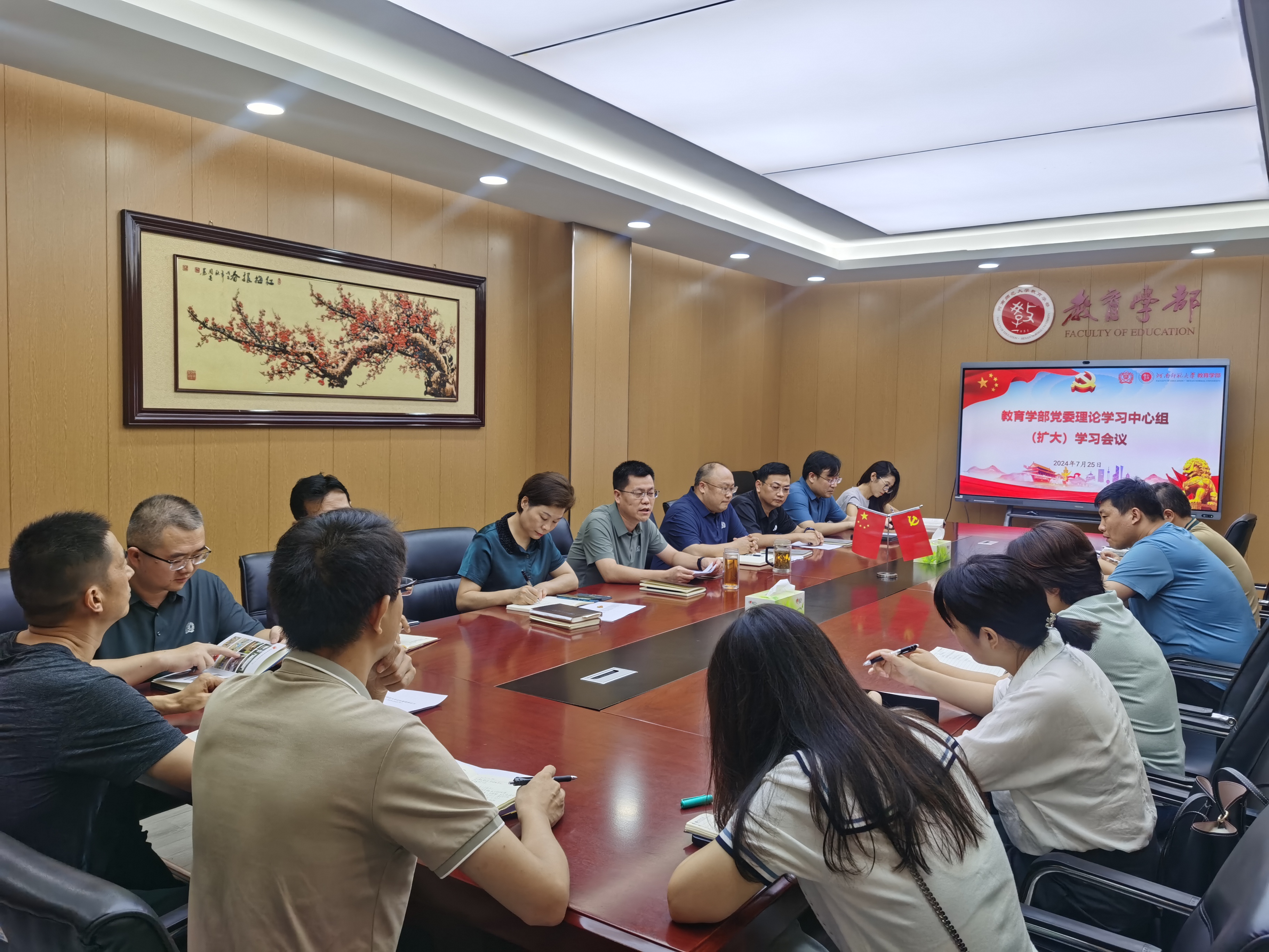7月25日下午,教育学部在田家炳教育书院801会议室召开党委理论学习中心组(扩大)学习会议,专题学习党的二十届三中全会精神,学部党政领导班子、党委委员、教工党支部书记及专职辅导员参加学习,会议由学部党委书记陈勇主持。