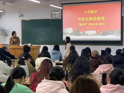 11月12日上午,河南师范大学教育学部“中原名师进课堂”系列活动正式拉开帷幕。首场活动特邀河南省学术技术带头人、中原名师、许昌实验小学尹赛丽校长走进《小学数学课程与教学》课堂,为本科生进行教学技能示范与指导。来自河南师范大学附属小学、新乡市牧野区杨岗小学、红旗区金穗大道小学、世青小学的教师代表,以及小学教育专业的本科生和研究生共120余人参与了此次活动。