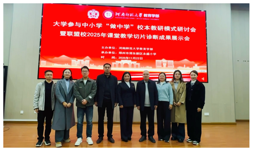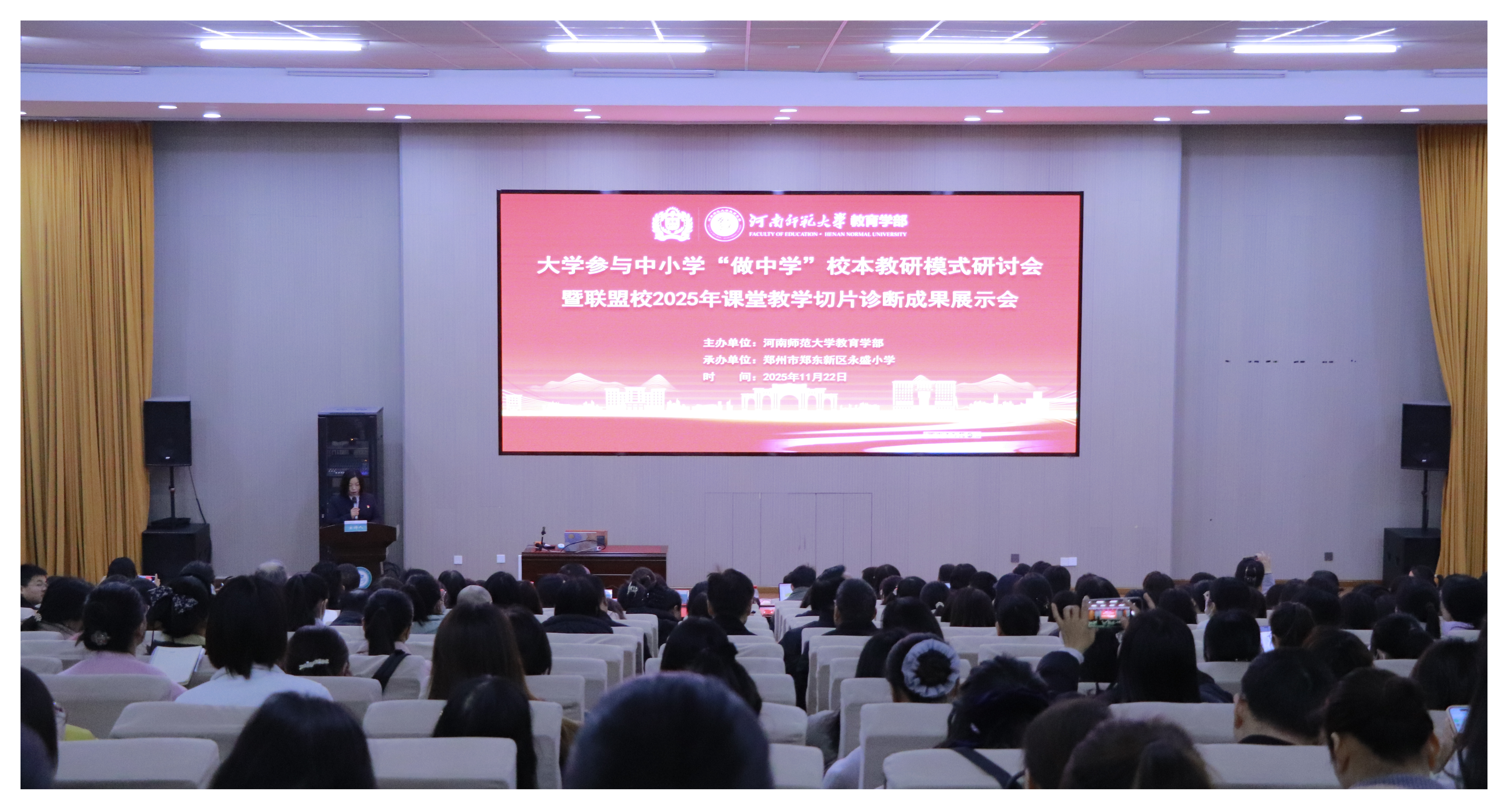 为深入贯彻国家推动教育高质量发展、建设教育强国的战略部署,积极响应新时代基础教育扩优提质要求,河南师范大学教育学部充分发挥高校在教师教育中的专业引领作用,于11月22日在郑州市郑东新区永盛小学成功举办“大学参与中小学‘做中学’校本教研模式研讨会暨联盟校2025年课堂教学切片诊断成果展示会”。陕西师范大学民族教育学院院长龙宝新教授、北京师范大学教育学部周序副教授、河南师范大学教育学部部长罗红艳教授、河南师范大学教育学部魏宏聚教授、郑东新区基础教育教学研究室党支部书记郭文祥、郑州市郑东新区教育文化体育局党委委员罗玲、郑州永盛小学书记蒋蕊、校长李志芳,以及河南师范大学教学切片诊断研究团队与省内中小学教师代表五百余人受邀出席。会议围绕高校深度参与中小学教研、赋能教师专业成长展开深入研讨。