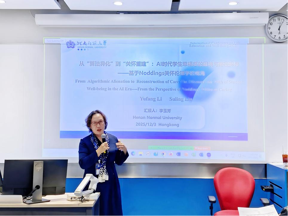 李玉芳在分会场作了题为《从“算法异化”到“关怀重建”:AI时代学生幸福感的困境与教育突围——基于Noddings关怀伦理学的视角》的专题学术报告。报告深入剖析了AI时代算法异化引发的三重教育危机,创新性地提出了“三位一体”的关怀教育模型。其研究视角新颖,论述系统深入,引发了与会学者的广泛关注与积极讨论。刘素玲在会议期间积极参与学术研讨,与来自不同国家和地区的学者展开深入交流,围绕生命教育与幸福主题分享了见解。