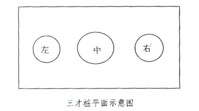 比赛所用场地见第七条二。如果为室内场地,其空间高度不得低于5米。赛场中间布设三才桩:3根桩排列于一直线上,中间桩的直径为35厘米,两侧桩的直径为30厘米,相邻之桩与桩间的间隔距离为35厘米,桩高均为60厘米。(如下图)赛场三才桩由大会统一布置。