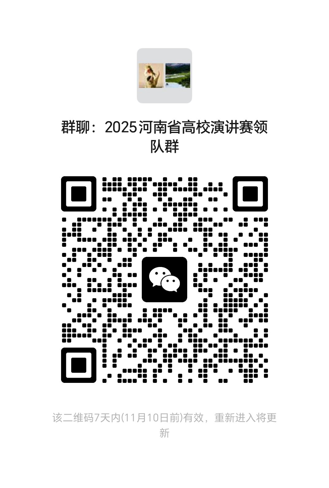 2025年河南省高校“铸牢共同体 中华一家亲”主题演讲比赛决赛通知群二维码如下,请各高校联络员扫码入群,入群后请及时修改备注为“学校+姓名”,感谢配合!