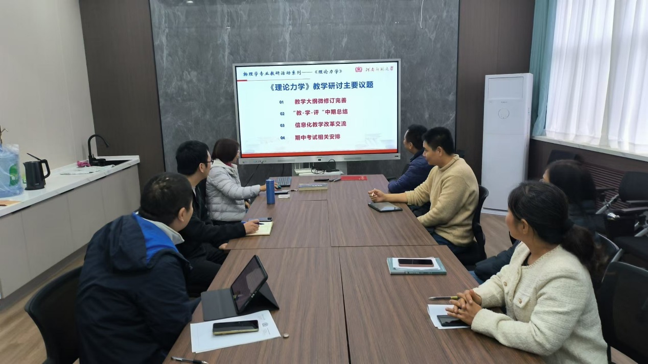11月14日,河南省一流本科课程《理论力学》教学团队,在物理南楼217会议室举行了本学期第二次教学研讨会,参会教师有衡朝霞、程凯旋、楚兴丽、张岩星副教授、青年博士严鑫帅和黎文峰共7人。会议由课程负责人马淑红教授主持,参会教师主要围绕三个议题进行了热烈的讨论和交流。